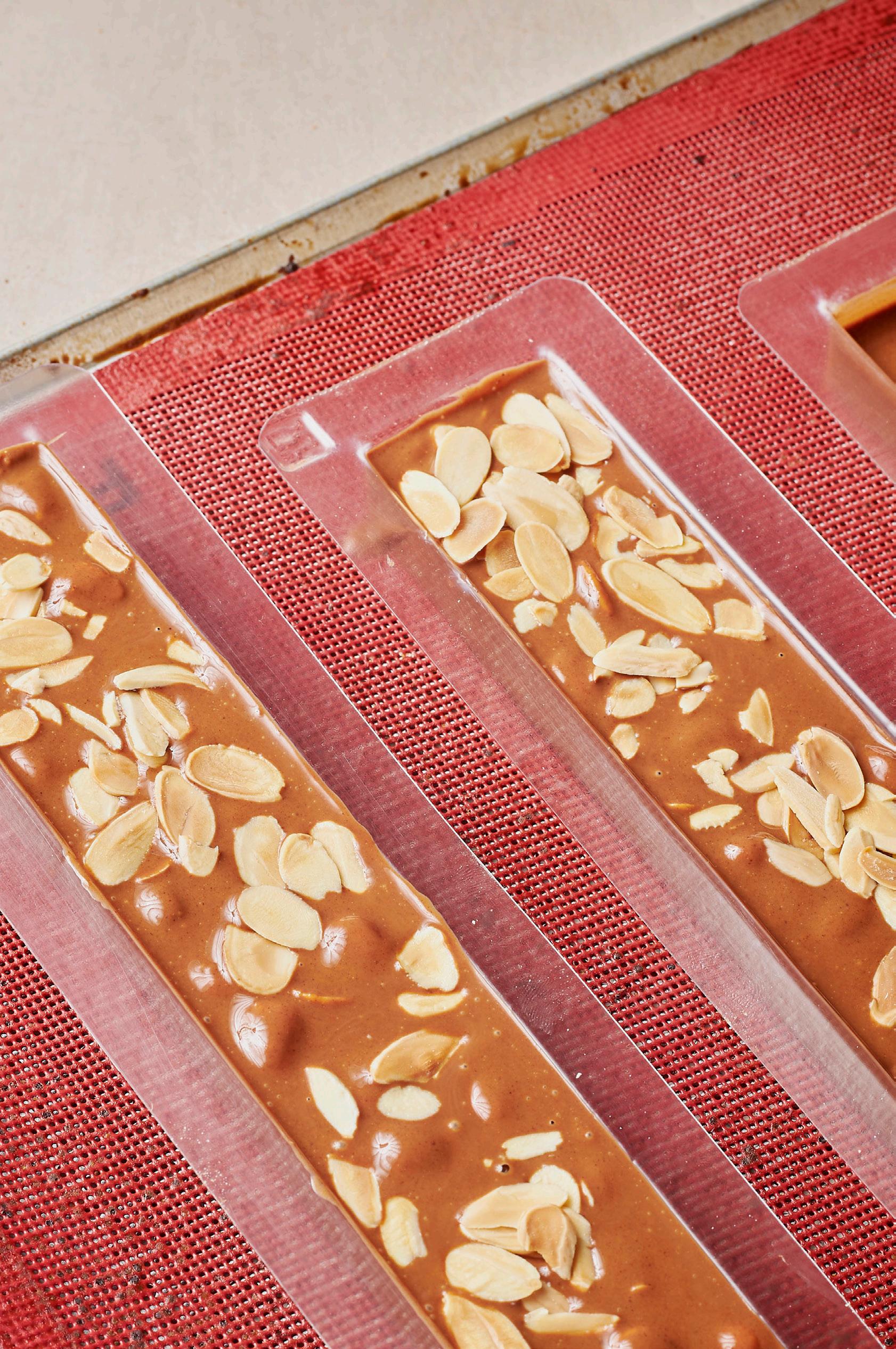 Banhar com chocolate aquecido e decorar com lâminas de amêndoa.