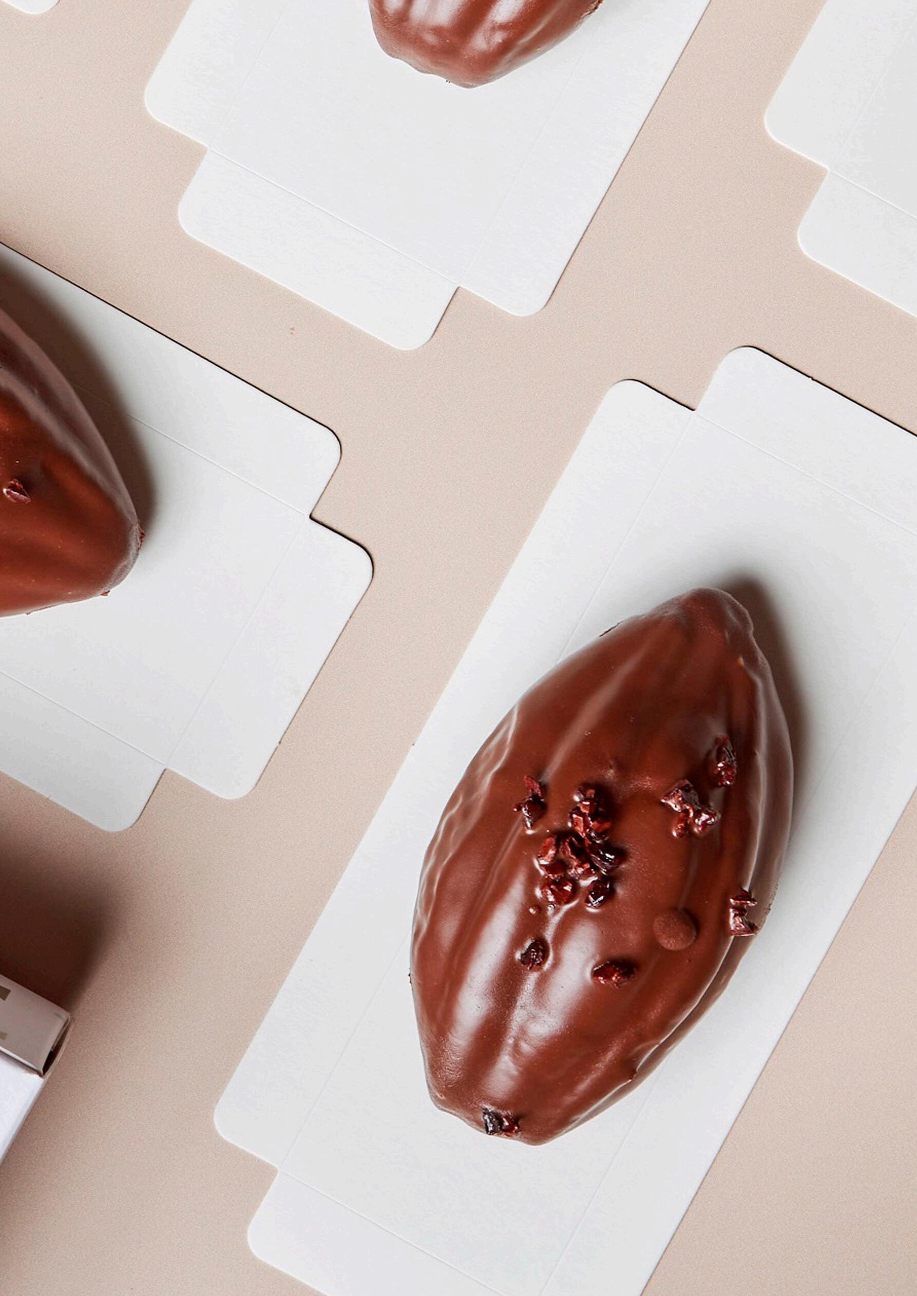 Banhar os cakes de maneira inversa e, antes de o chocolate cristalizar, decorar com nibs de cacau caramelizado.