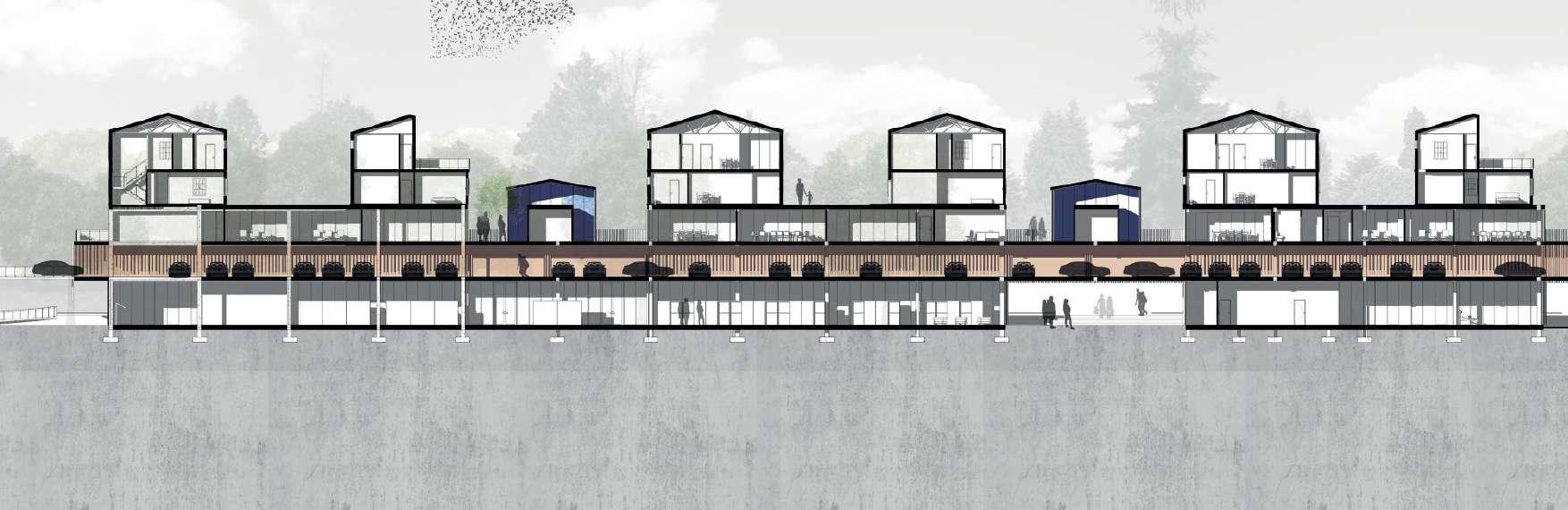 Le projet vise à répondre au besoin de logement tout en redynamisant une place principalement utilisée pour le stationnement. Un immeuble mixte est proposé pour combler les lacunes urbaines identifiées, offrant des logements, des bureaux et des commerces au rez-de-chaussée pour animer l’espace jour et nuit. De plus, le stationnement sera déplacé au premier étage dans un espace semi-fermé, anticipant ainsi les changements liés à l’arrivée d’une nouvelle ligne de métro à Montfermeil, suggérant une diminution de l’importance de la voiture dans la vie quotidienne des habitants.