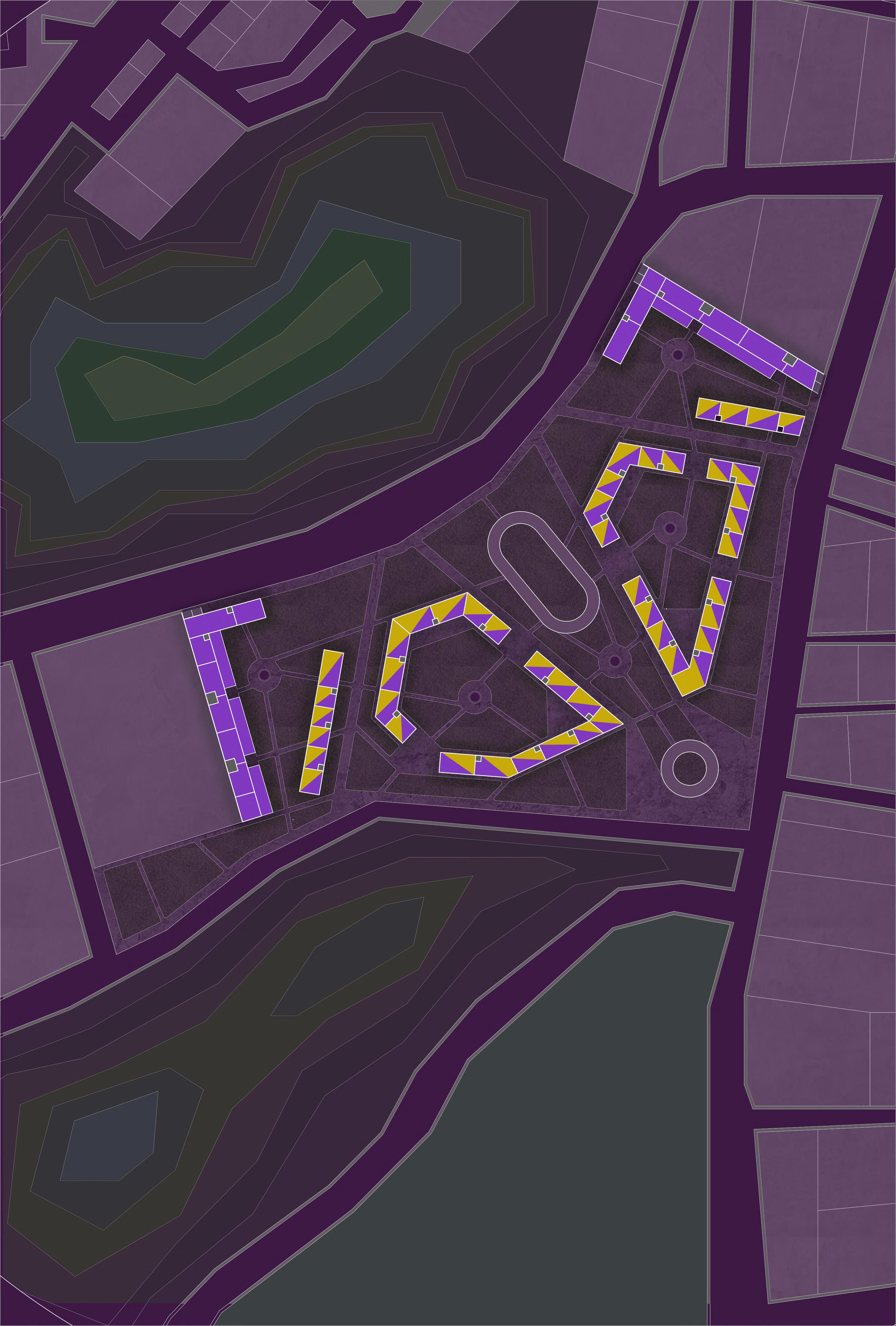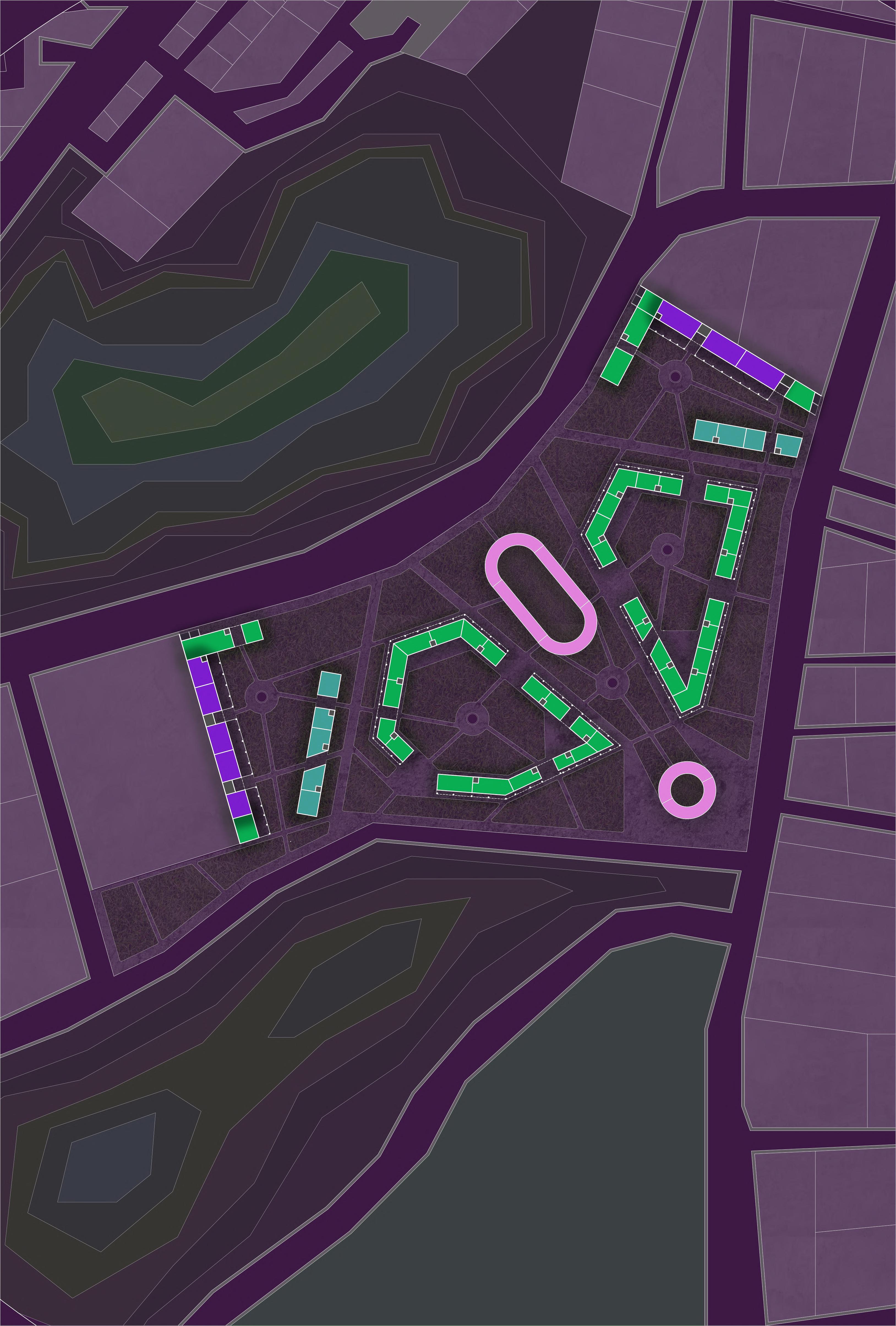 La primera planta sera la mas variada en terminos de equipamiento que serviran para tanto usuarios de las viviendas como de externos. En los volumenes laterales incluiremos comercio para la vereda perimetral y viviendas que comienzan a marcar la distincion entre los espacios publicos y semi-publicos del proyecto. En las volumetrias tipo barra, se aplicara la industria que servira como frente entre la via principal y la manzana mas independiente. Posteriormente, las manzanas cerradas por bloques en diagonal tendran un 100% de funcion comercial ayudada por los soportales de la volumetria que amplairan el peaton para generar una experiencia entre la arquiectura y el esapcio publico, ademas de brindar mayor ancho a la via principal. Por ultimo, los volumenes curvos de la plza principal seran destinados al programa Dotacional paara la cultura y recreacion de los mas jovenes
