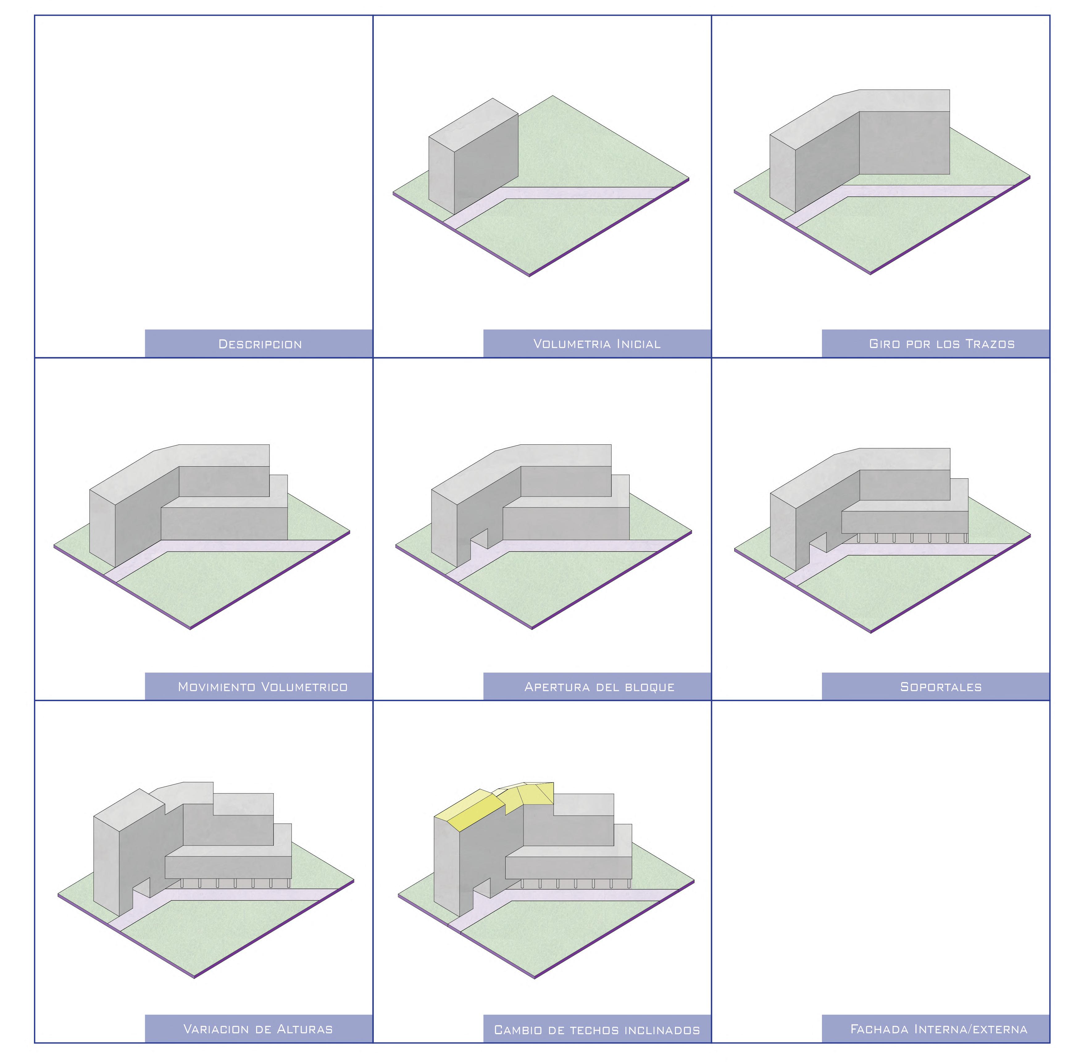 Una volumetria de tipo barra evoluciona dependiendo de factores como el terreno, las personas y el clima. Las sendas interiores primaraias y secundarias pueden forzar a la volumetria a girar o tener un tunel en medio para respetar y priorizar el peaton. Para aquellas cuya funcionalidad vaya a tener un proposito publico como el comercio, se generaran soportales para que la forma de el suelo y las edificaciones interactuen con la poblacion generando un mayor espacio de peaton y de recreacion. Asimismo, las volumetrias al tener fachadas prolongadas, tendran un ensanchamiento en perfiles seleccionados con el fin de generar una mejor experiencia visual y asimismo ampliar el espacio privado y generar un juego de alturas.Estas mencionadas van a variar entre 6, 8 y 10 pisos y van a tener un remate de techos inclinados para dirigir las aguas a regar las areas verdes. An cuanto a las fachadas, van a depender si estan dirigidas hacia un espacio publico o una manzana semi-privada con el fin de resguardar la comodidad de los usuarios en las volumetrias y el pasar y experiencia de las personas en la primera planta. Ademas se Aplicaran volumetrias ovales para el equipamiento ubrano para suplementar las areas verdes y generar puntos de encuentro jerarquicos en la composicion.