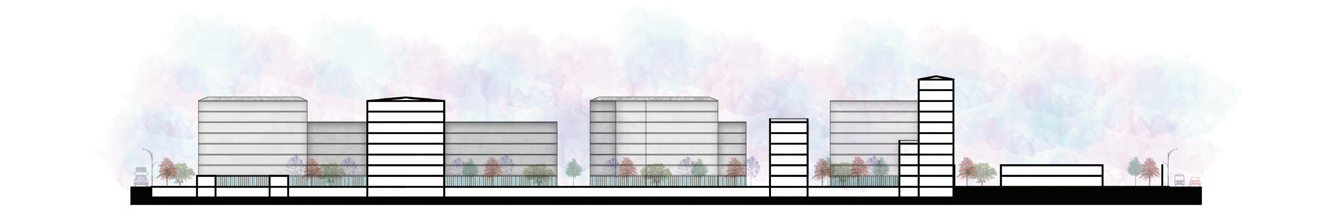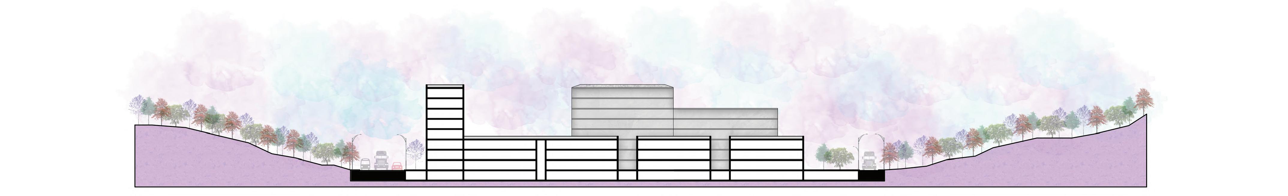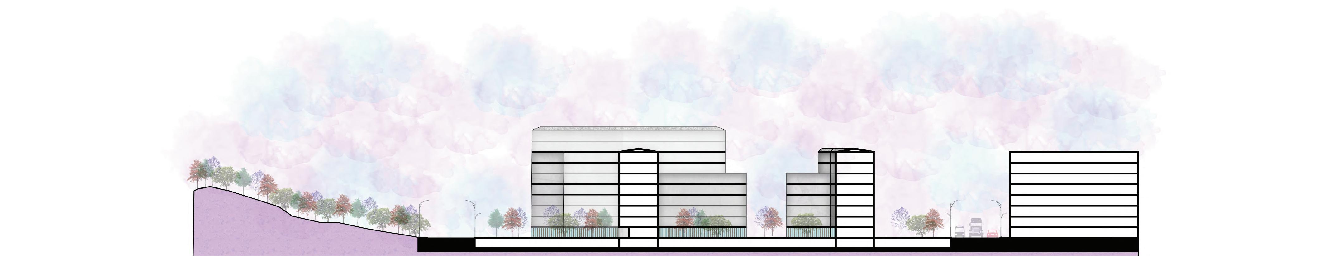 Las secciones nos apoyaron a verificar como se conformaban las calles aledanias y reconocer la forma del contexto tanto urbano como natural. pudimos observar como las alturas alternaban entre 6 a 12 pisos de altura para los edificios, lo cual marcaron el parametro para nuestras volumetrias del proyecto. Posteriormente, habia un factor importante que eran las colinas que abrazaban al proyecto. Estas podian ser utilizadas como referencia para no incomodar las visuales de los programas de los edificios y ademas, con nuestra tecnica de ampliar el espacio publico a los laterales del proyecto, podiamos magnificar su integracion y unir sus sendas con las del poryecto y generar un fluido entre las dos caras del proyecto.