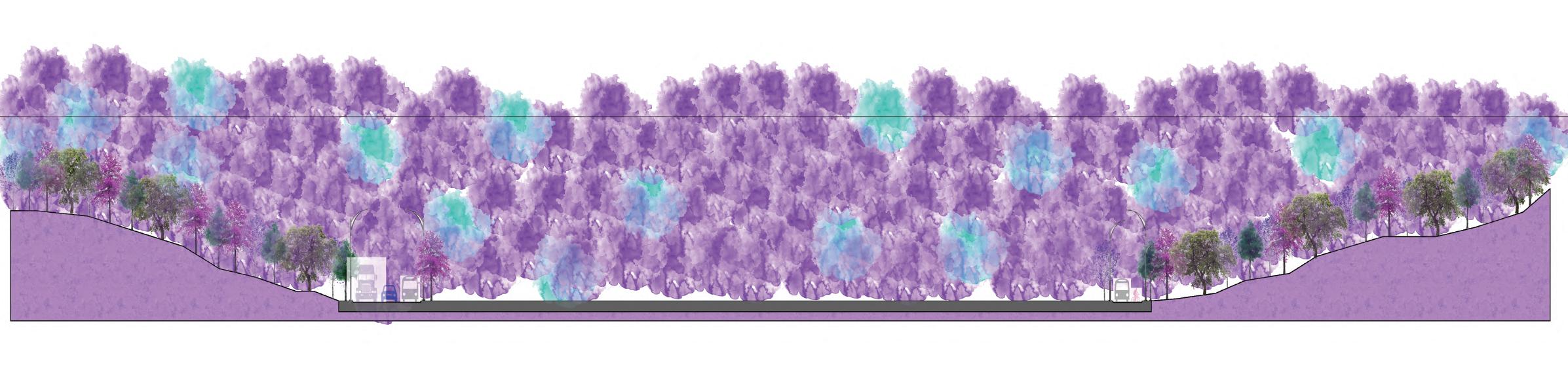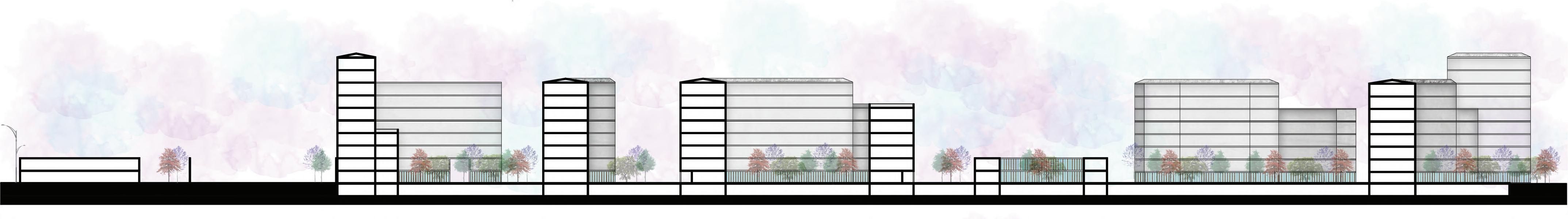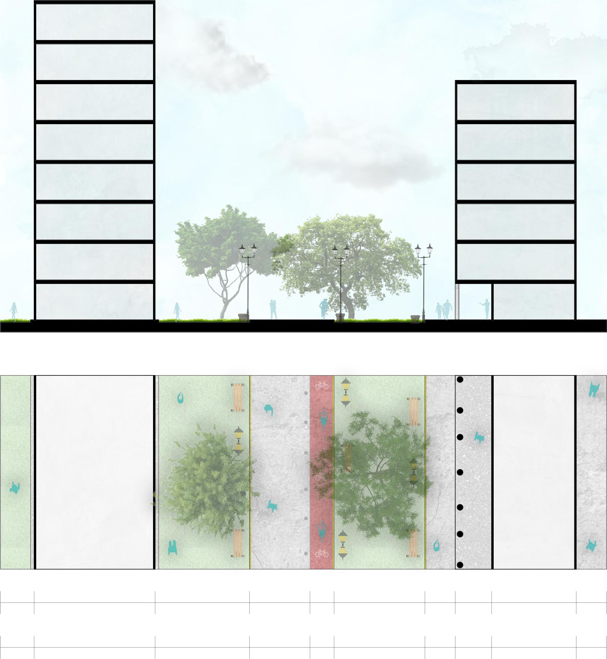 Las secciones nos apoyaron a verificar como se conformaban las calles aledanias y reconocer la forma del contexto tanto urbano como natural. pudimos observar como las alturas alternaban entre 6 a 12 pisos de altura para los edificios, lo cual marcaron el parametro para nuestras volumetrias del proyecto. Posteriormente, habia un factor importante que eran las colinas que abrazaban al proyecto. Estas podian ser utilizadas como referencia para no incomodar las visuales de los programas de los edificios y ademas, con nuestra tecnica de ampliar el espacio publico a los laterales del proyecto, podiamos magnificar su integracion y unir sus sendas con las del poryecto y generar un fluido entre las dos caras del proyecto.
