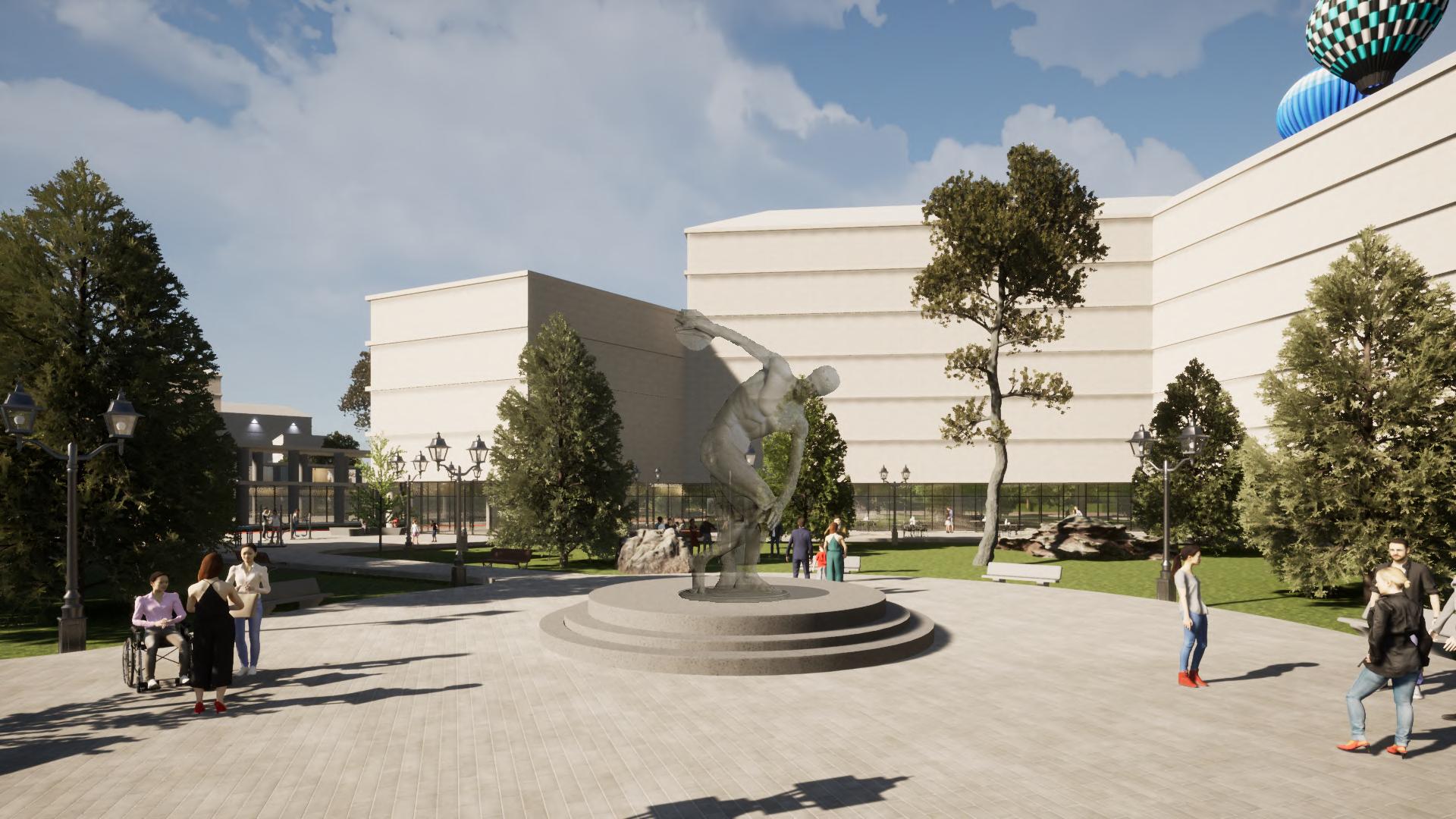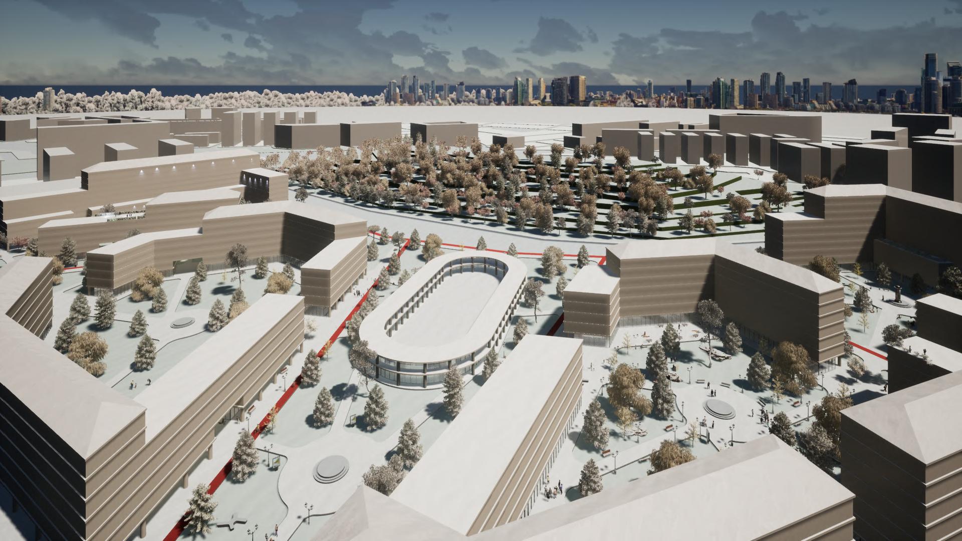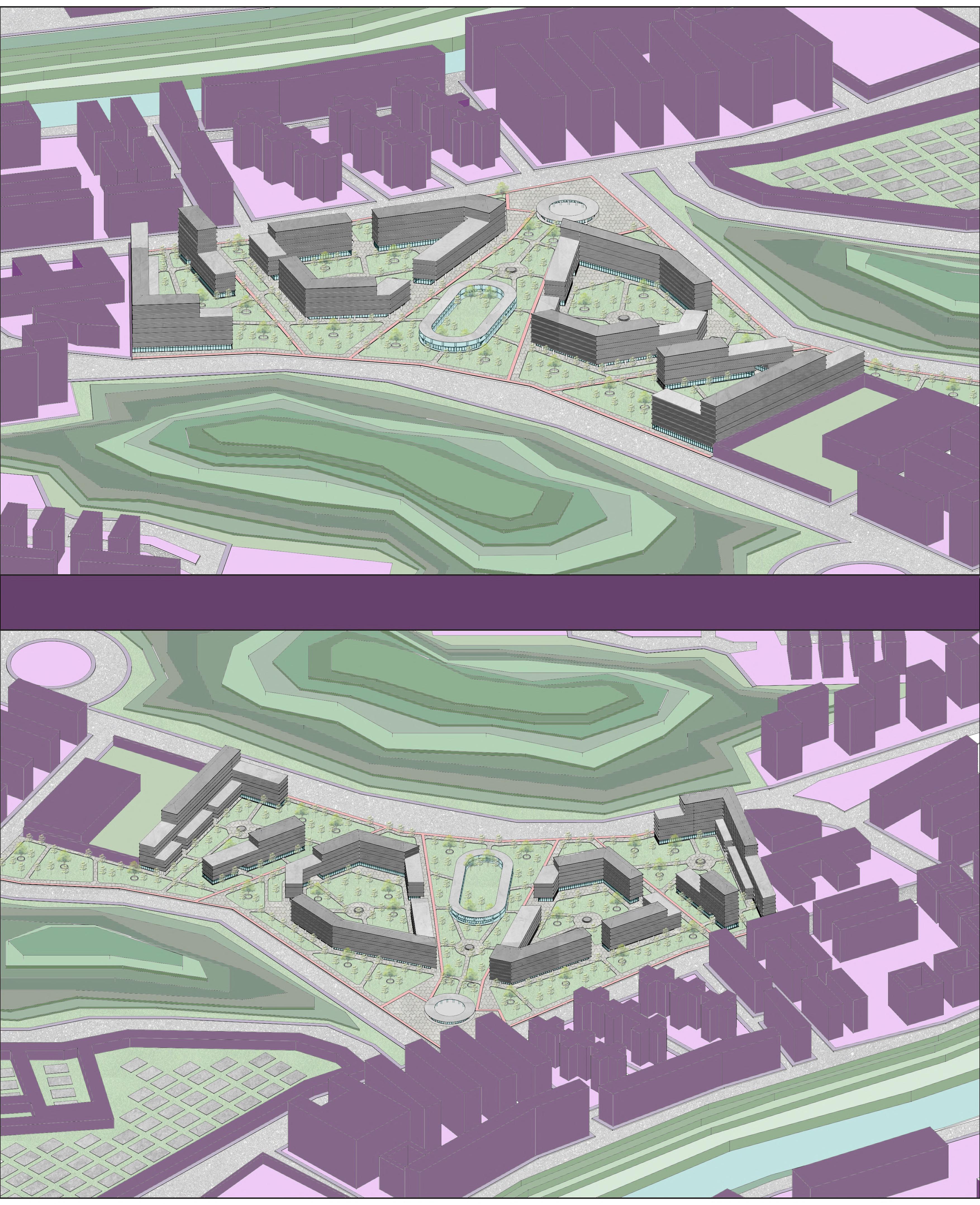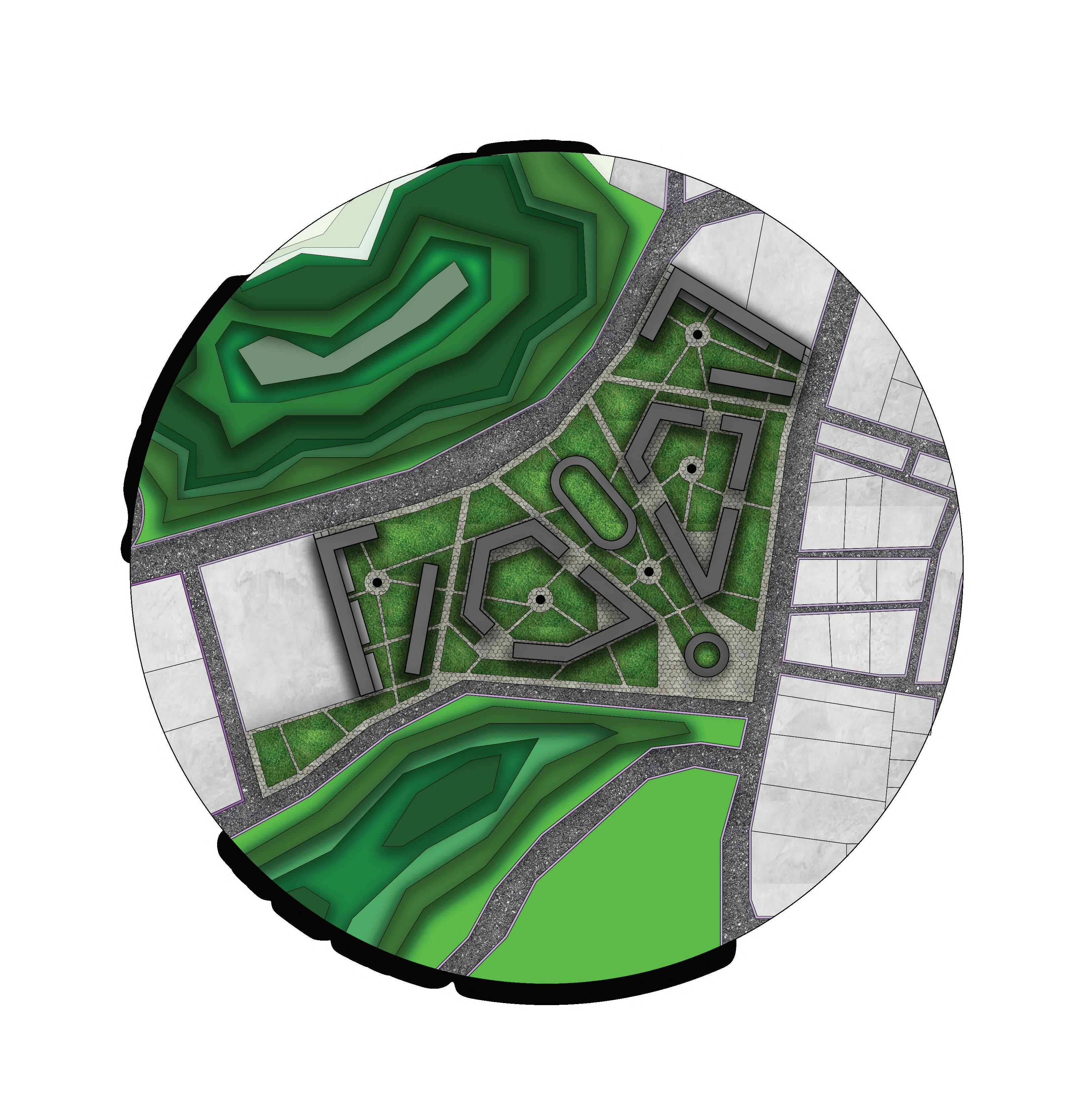 La vista superior nos muestra como el resultado final del proyecto puede conectar ambos parques en topografia y ademas no se ve como un proyecto aislado de su entorno. Vemos como las rutas primarias conectas ambos perfiles y van en relacion con la trama urbana ya existente colidante y en terminos de columetria, los pliegues se asemejan a las formas de los edificios de madrid y las alturas estan a la par con el entorno para no generar una obstruccion urbana, sino mantener la escala dentro del barrio Mirador de Austrias