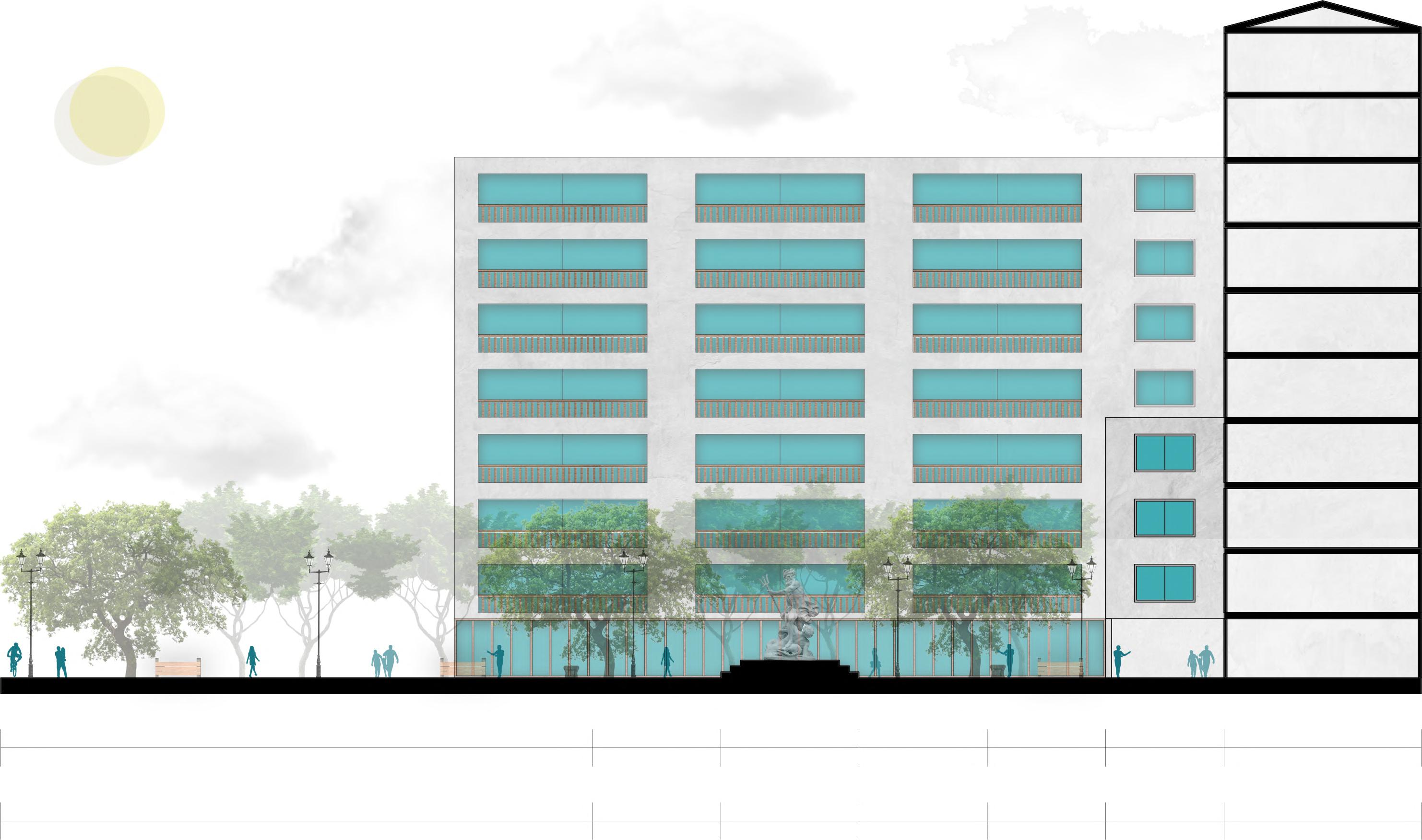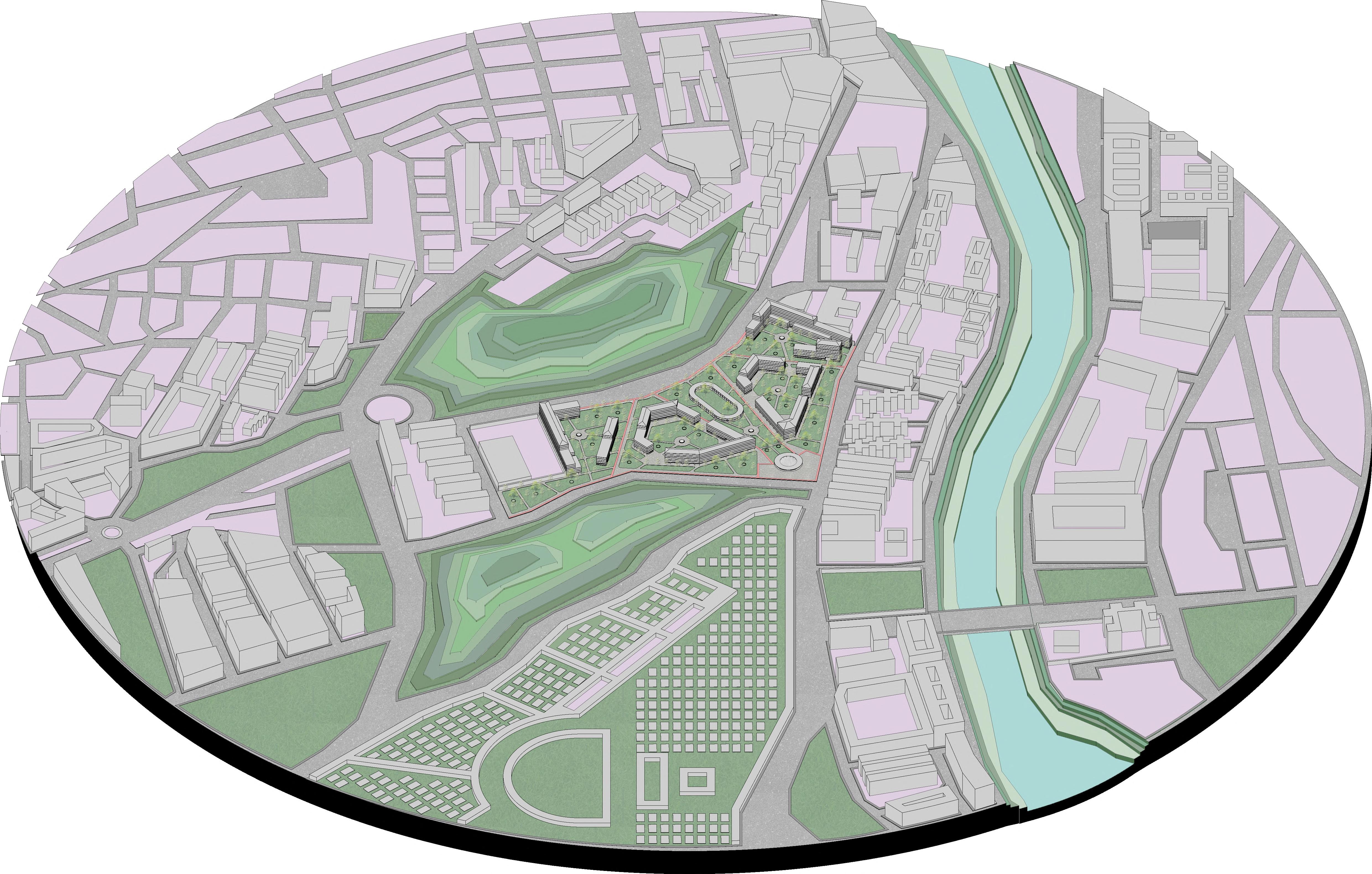 El proyecto esta emplazado en la urbanizacion mirador de los austrias, en el distrito de latin. Esta ubicacion mayormente residencial es reconocida por su proximidad al rio manzanares y pos su amplia conectividad con el area verde que rodea la capital. Asimismo, es una de las zonas de madrid que cuenta con colinas como espacios publicos que abrazan al terreno y prmiten una relacion tanto con el espacio publico y la exprencia peotnal como la visual hacia el resto de la ciudad. el terreno actualmente esta ocupado por el centro comercial La Ermita, pero el objetivo de este traajo es proponer un complejo residencial que contenga equipamientos urbanos para suplementar las demandas de los habitantes como externos al terreno con el fin de salvaguardar este punto comercial jeraruqico del barrio y espacio publico e incoporar mayor numero de viviendas gracias a la altura