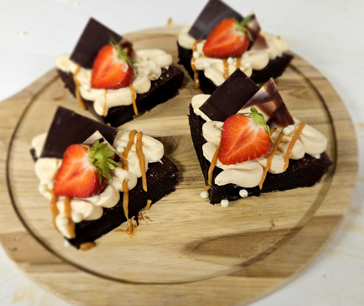 Kladdkaka med dulche de leche-grädde, chokladpynt, jordgubbe. 2-pack. Börjes