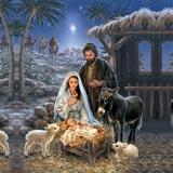 Text: Stilla natt heliga natt. På baksidan finns julevangeliet från Barnens bibel, men med några saknade ord. Fyll i de 24 orden från luckorna, på rätt plats, så julevangeliet går att läsa.