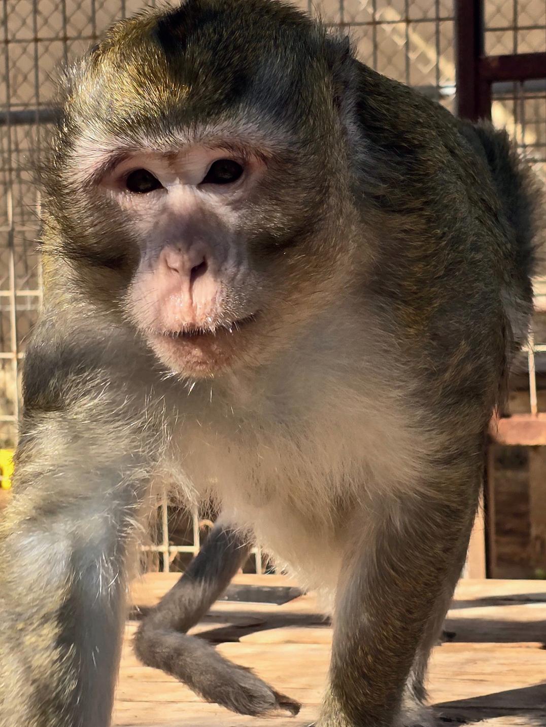 Pablito is a young rhesus macaque who was found running around the streets of Laredo, Texas. The little monkey was struck by a vehicle and suffered severe head wounds. Incredibly, he not only survived, but he made a full recovery. Since his arrival in March, he has been living with long-term resident, Dawkins, and has recently been joined by Oliver, another rhesus macaque who has been cared for at the sanctuary for many years. The three friends now spend their days in content companionship.