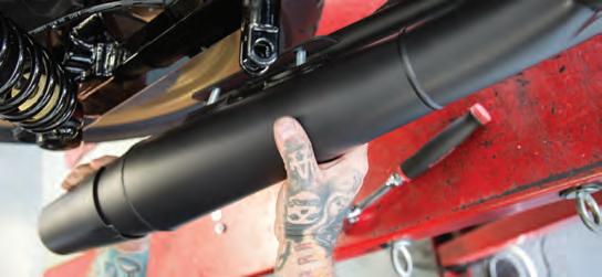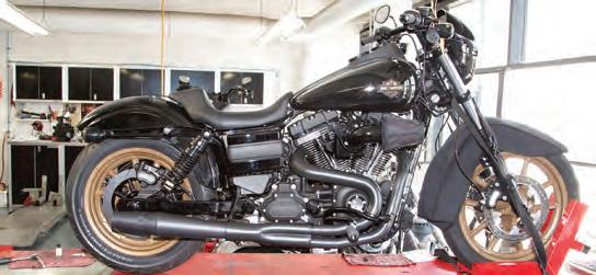 Even though there are a bazillion people out here in Southern California where I live, we can think of lots of good reasons to be one of them. Those positive reasons are called canyon roads! And these roads have created a red hot used-bike market for Harley’s 2017 Low Rider S. Most of the bikes that Harley built on its Dyna platform handled very well. Then, with the introduction of the 2017 Low Rider S, aka FXDLS, Harley took the Dyna label to a whole new level of performance. For the ’17 FXDLS models, Harley added the Screamin’ Eagle 110 cubic-inch motor, which gives these bikes a lot more resources to build on. Unfortunately, these bikes were also the end of the line for H-D’s Dyna style swingarm big-twin frame. But, like all stock motorcycles, the FXDLS has one huge performance drawback, the factory exhaust system. To start off, its sound quality lacks personality and then the 2-into-1-into-2 system doesn’t really allow that big motor to meet its true performance potential. No matter what you ride, the crew at Thunderheader have an exhaust system for you. For this Dyna they developed a true 2-into-1 highperformance exhaust system that lets all of those 110 cubic inches breathe. But wait, you say breathe, we’re talking about an exhaust system, not an air filter or throttle body. I know, but an internal combustion motor’s breathing starts by filling an empty combustion chamber, and it requires a well performing exhaust system to clear the combustion chamber of all of the motor’s burnt gases. The Thunderheader exhaust system features a muffler that produces a suction effect inside of the last foot or so of the exhaust pipe. This suction actually pulls the exhaust gasses out until they reach the reverse cone located at the muffler’s exit end. So we ordered their black system, part number 1035B, MSRP $845 and matching heat shields, part number 1131B, MSRP $253.