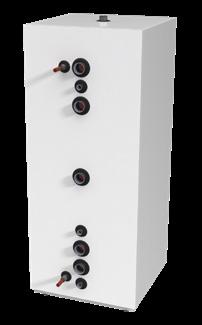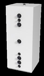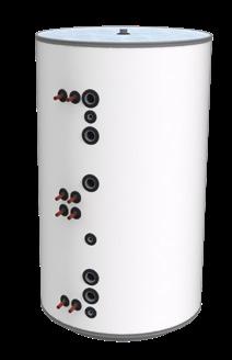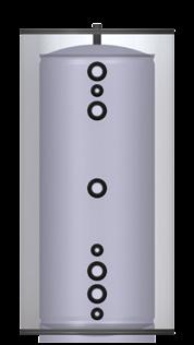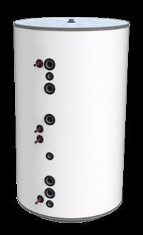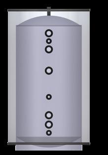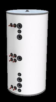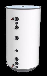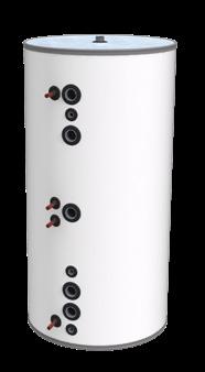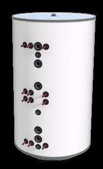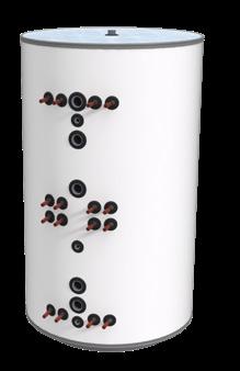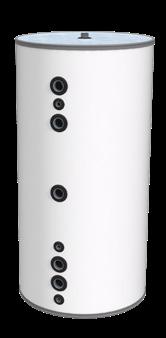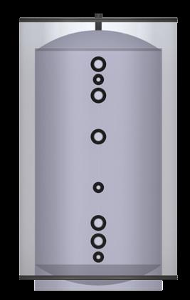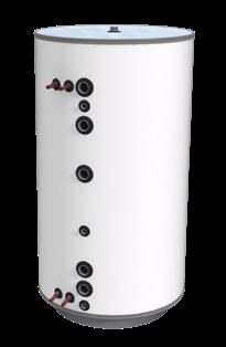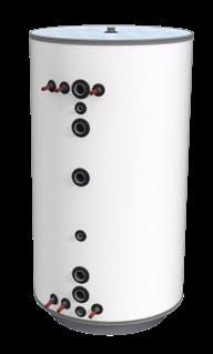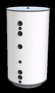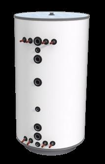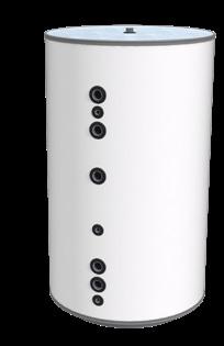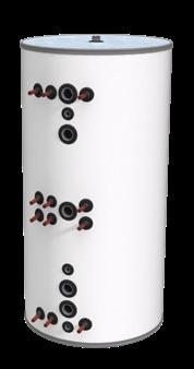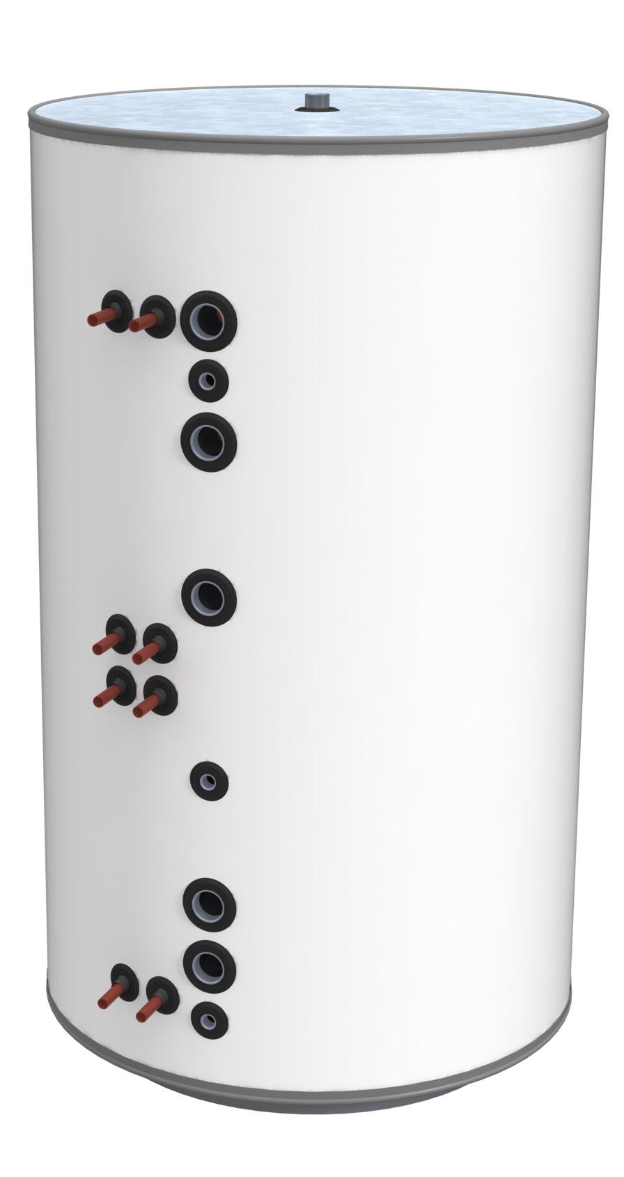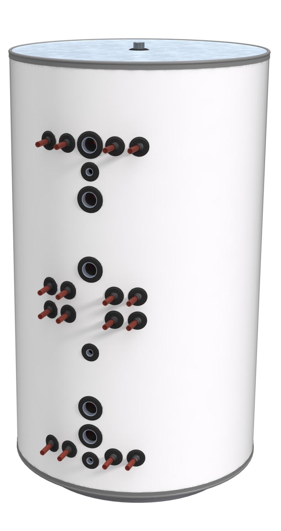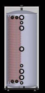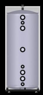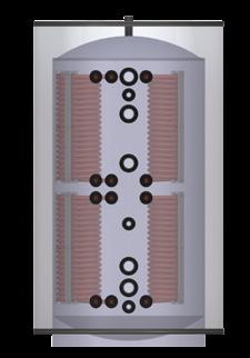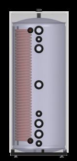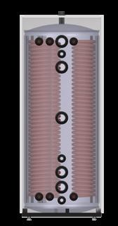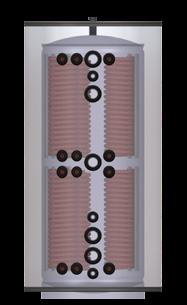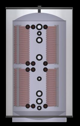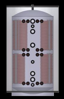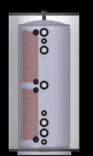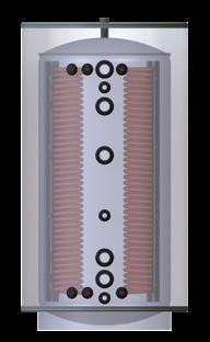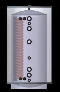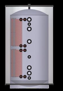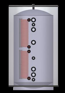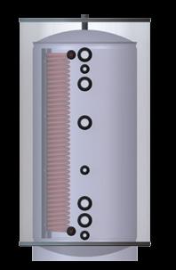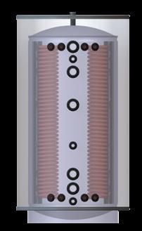 Kan användas som en multifunktionstank. Varmvattenslingan omges av hela tankens lagringsvolym som kan uppvärmas med flera olika värmekällor t.ex. värmepump och el-patron.
