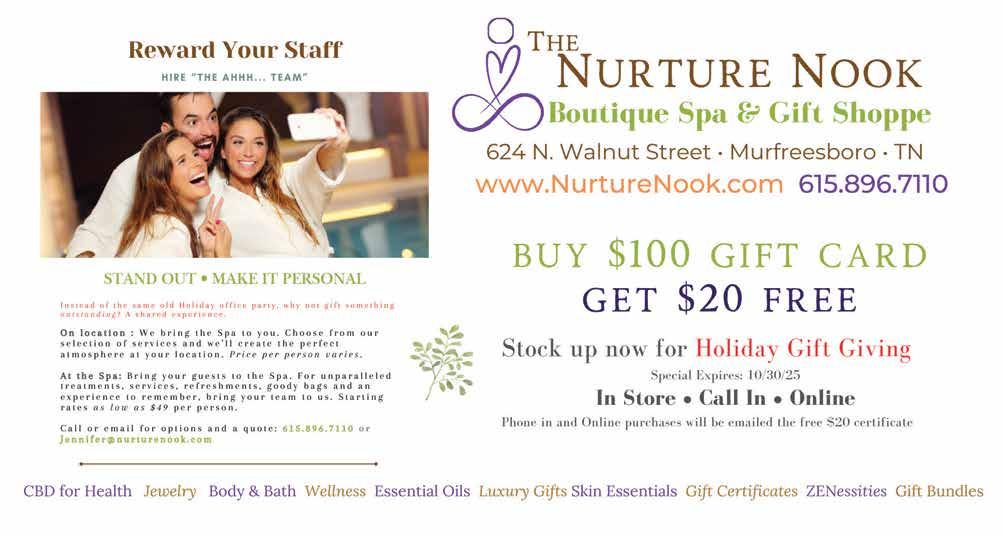 Jennifer durand is the owner and operator of The Nurture Nook day Spa & gift Shoppe. Call 615896-7110 or visit facebook.com/nurturenookdayspa or nurturenook.com for more.