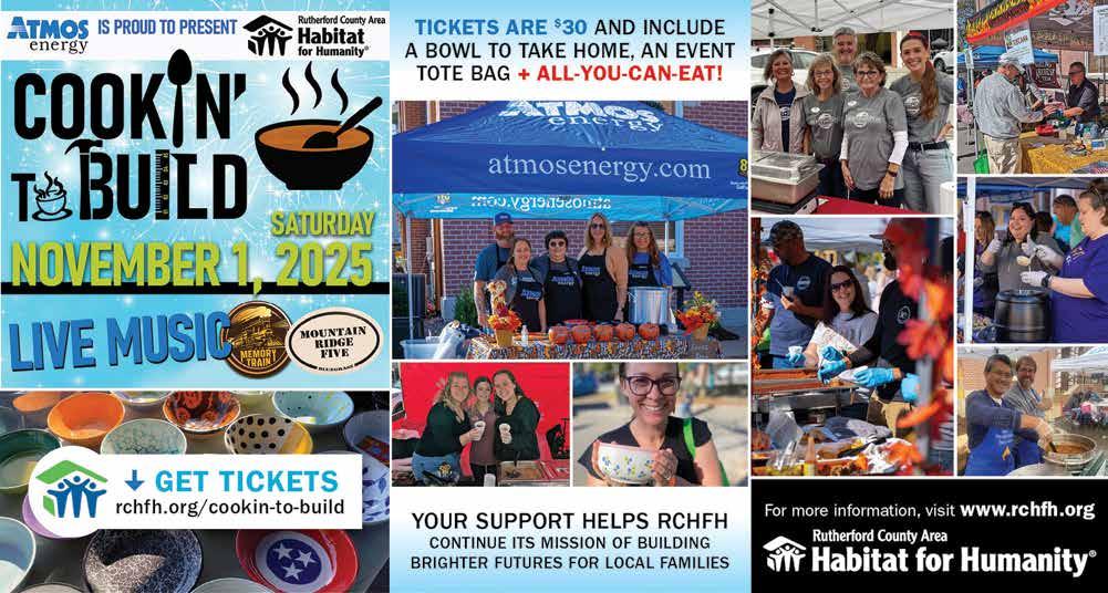 Have fun painting a bowl for this year’s Cookin’ to Build, benefiting the Rutherford County Area Habitat for Humanity, through Oct. 15. Visit Color Me Mine at The Avenue (2615 Medical Center Pkwy., #1520) and have a bowl-painting party with family, friends or co-workers. Purchase your bowl and Cookin’ to Build ticket there. The $30 ticket includes the bowl painting, tote bag and Cookin’ to Build event ticket, which will get participants all-you-can-eat chili, soup, stew and gumbo plus desserts and drinks the day of the soup-themed fundraiser event, Saturday, Nov. 1, on the Murfreesboro Public Square. Please let Color Me Mine know in advance if you have a large group wanting to paint bowls. Contact the studio by calling 615-893-5556. Proceeds from the event help Habitat for Humanity raise money to build more affordable homes for local low-moderate income families. For more information, visit rchfh.org/cookin-to-build or find the 2025 Cookin’ to Build event on Eventbrite.