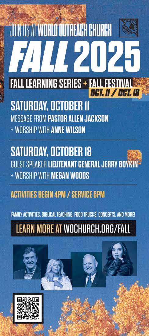 World Outreach Church hosts its outdoor Fall Festival on Saturdays, Oct. 11 and Oct. 18. Festivities begin at 4 p.m. with food trucks and family activities, with a worship service starting at 6 p.m. Both days will feature a biblical message and special guests, including Anne Wilson