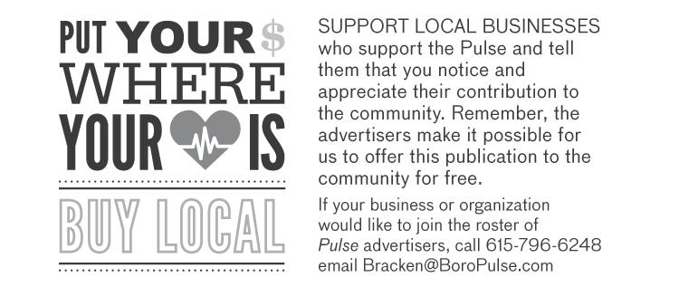 Just like The Chicken Band—Uncle Dave’s band years ago, included in last month’s issue of the Pulse—accepted payment for performances in fried chicken, the Pulse just may accept chicken (or steak, sushi, eggs, veggies, guns, nuts, honey, gold or tacos) for advertising space. Small businesses of Murfreesboro—we welcome mutually beneficial barter arrangements! Let us know what you offer; we may be able to work something out: bracken@boropulse.com.