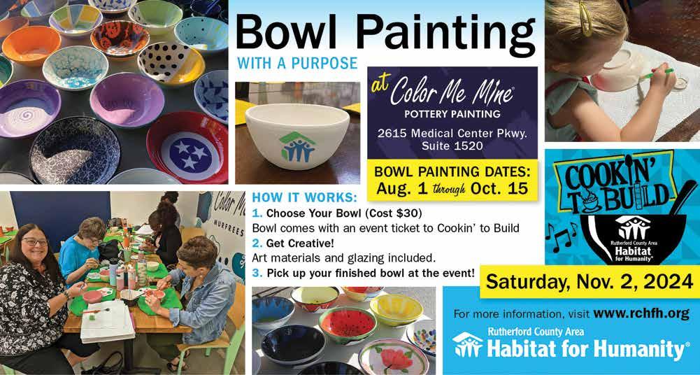 Bowl painting for this year’s Cookin’ to Build, benefiting the Rutherford County Area Habitat for Humanity, continues throughout September. Visit Color Me Mine at The Avenue (2615 Medical Center Pkwy., #1520) and have a bowlpainting party with family, friends or coworkers. Purchase your bowl and Cookin’ to Build ticket there. The $30 ticket includes the bowl painting, tote bag and Cookin’ to Build event ticket, which will get participants all-you-can-eat chili, soup, stew and gumbo plus desserts and drinks the day of the soup-themed fundraiser event, Saturday, Nov. 2, on the Murfreesboro Public Square. Please let Color Me Mine know in advance if you have a large group wanting to paint bowls. Funds raised help Habitat for Humanity raise money to build more affordable homes for low-moderate income families. For more information, visit rchfh.org/cookin-to-build, find the 2024 Cookin’ to Build event on Eventbrite or call 615-893-5556.