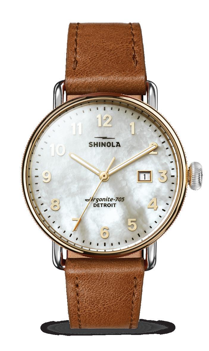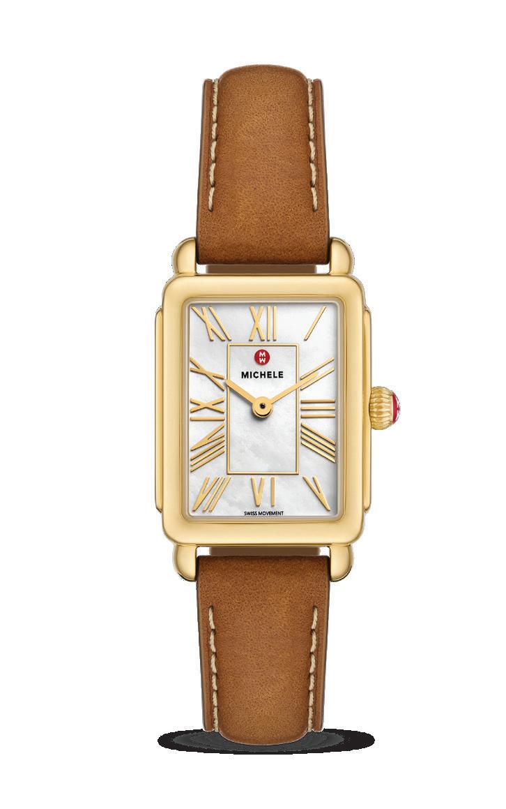 Two-tone Stainless Steel PVD Gold Case with White Mother-of-Pearl Dial on Tan Leather Strap, Quartz Movement