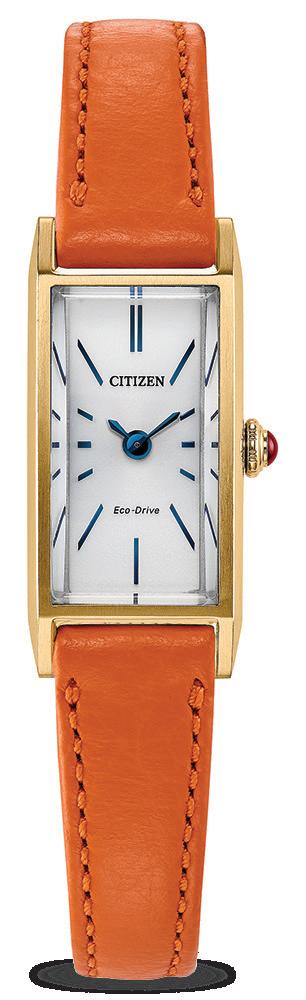 Yellow Gold-tone Stainless Steel Case with Silver Sunray Dial on Orange Leather Strap, Eco-Drive Quartz Movement