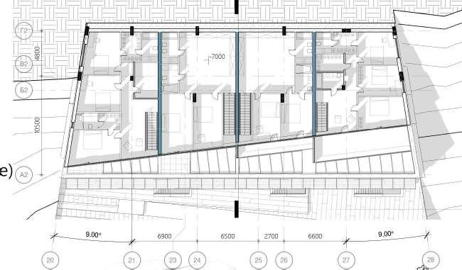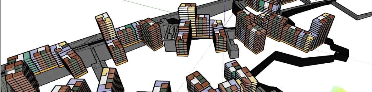 The visual solution showed three main qualities - openness, structure and diversity. I decided to design low-level buildings - 6 floors. The lower levelswillbeallocatedforcommercialuse,andthe upper levels will occupy residential apartments.