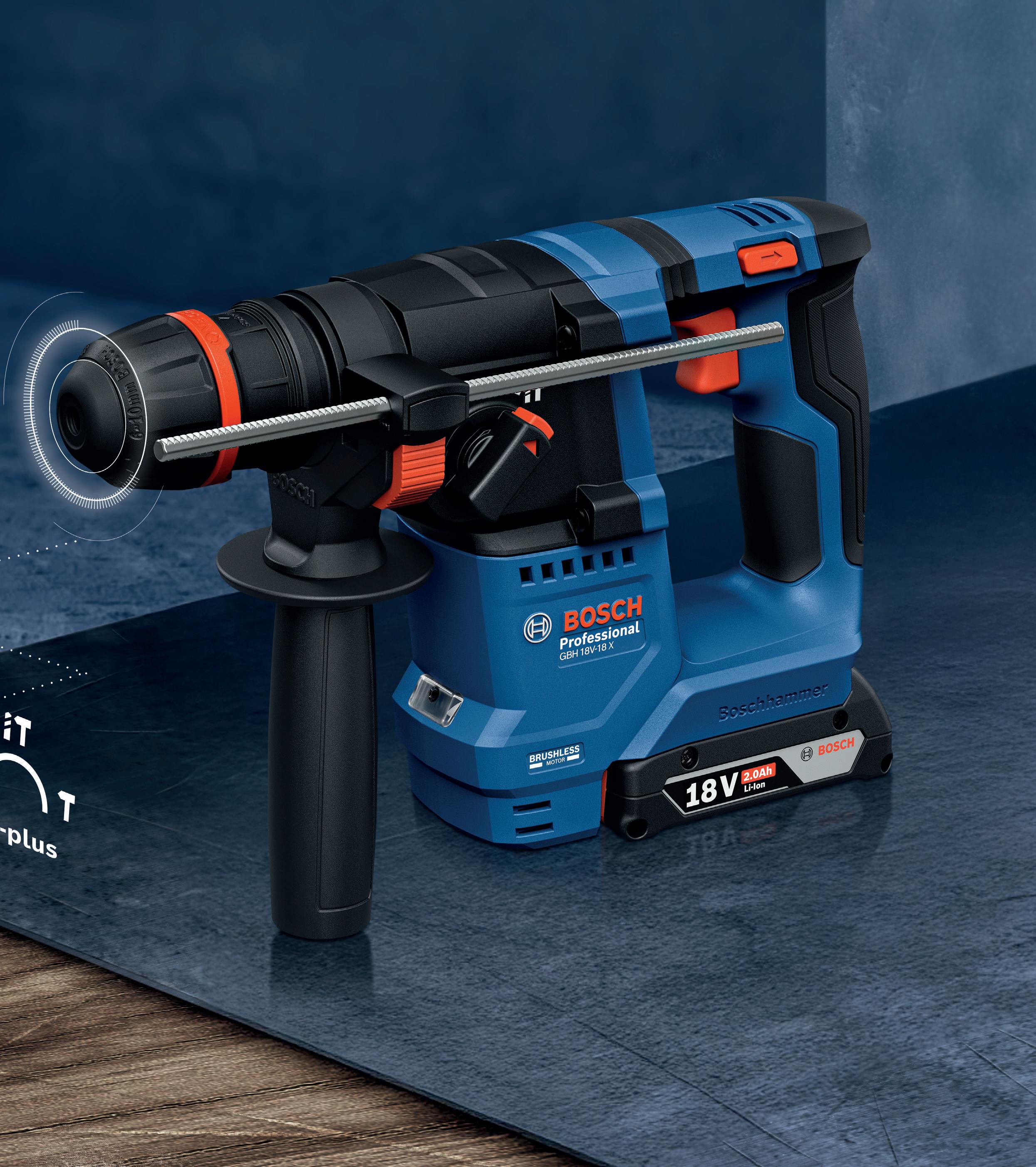 Más agujeros por carga de batería y fuerza de percusión continua, debido al motor brushless Bosch 18V con velocidad constante.
