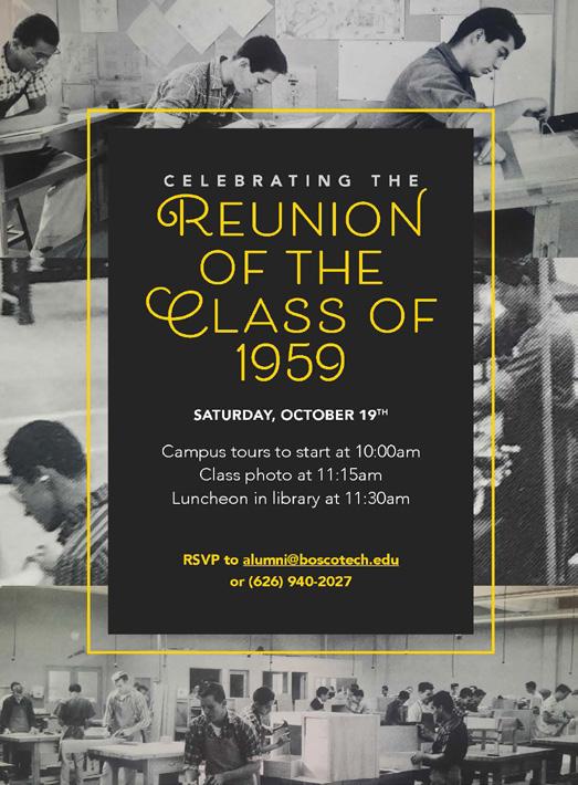 • Reunion weekend--The annual roundup will bring alumni of all graduating years back to campus. Kicking off with an all-alumni mixer and cocktail party on Friday, Oct. 18, the festive weekend will feature a special luncheon for our first grades, the class of 1959 on Saturday, Oct. 19, and milestone anniversary celebrations for seven classes on Saturday night. Please pass along the word to Techmen in your life and encourage them to visit boscotech.edu/reunion2024. It promises to be a fun weekend!