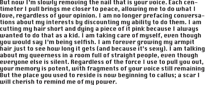 And so I ask: if I killed myself would it be enough? To my memory would you all make love? Would you regret the bile you spat, the bile I still taste? I bet you would still think I failed. How I long to live the life I desire! But until then, I can only trace the ridges across my forearms