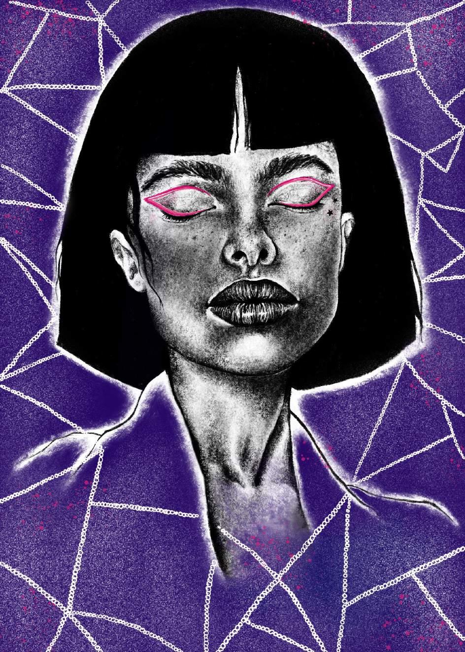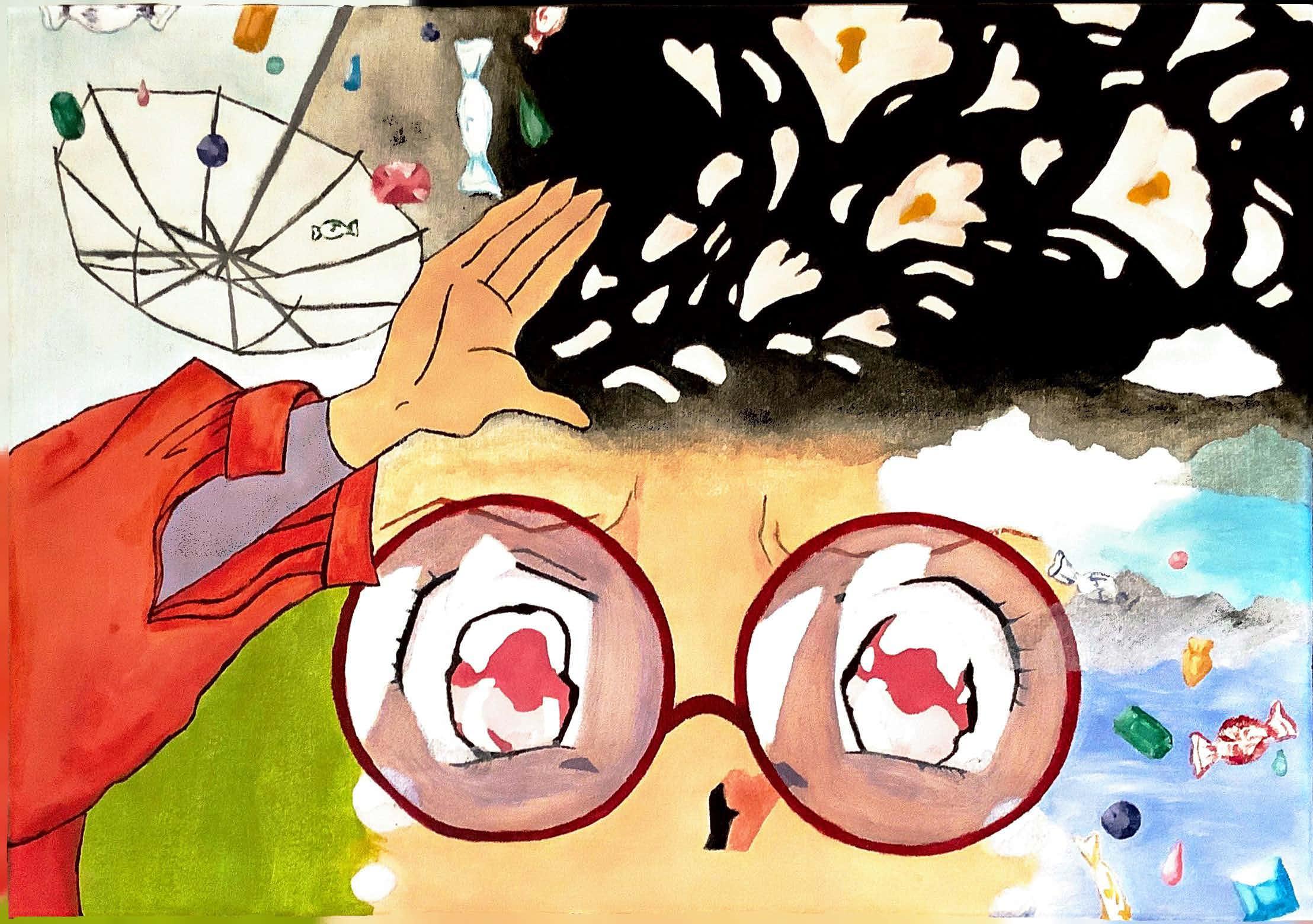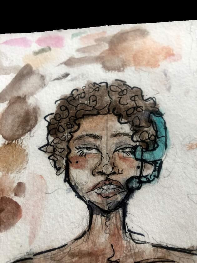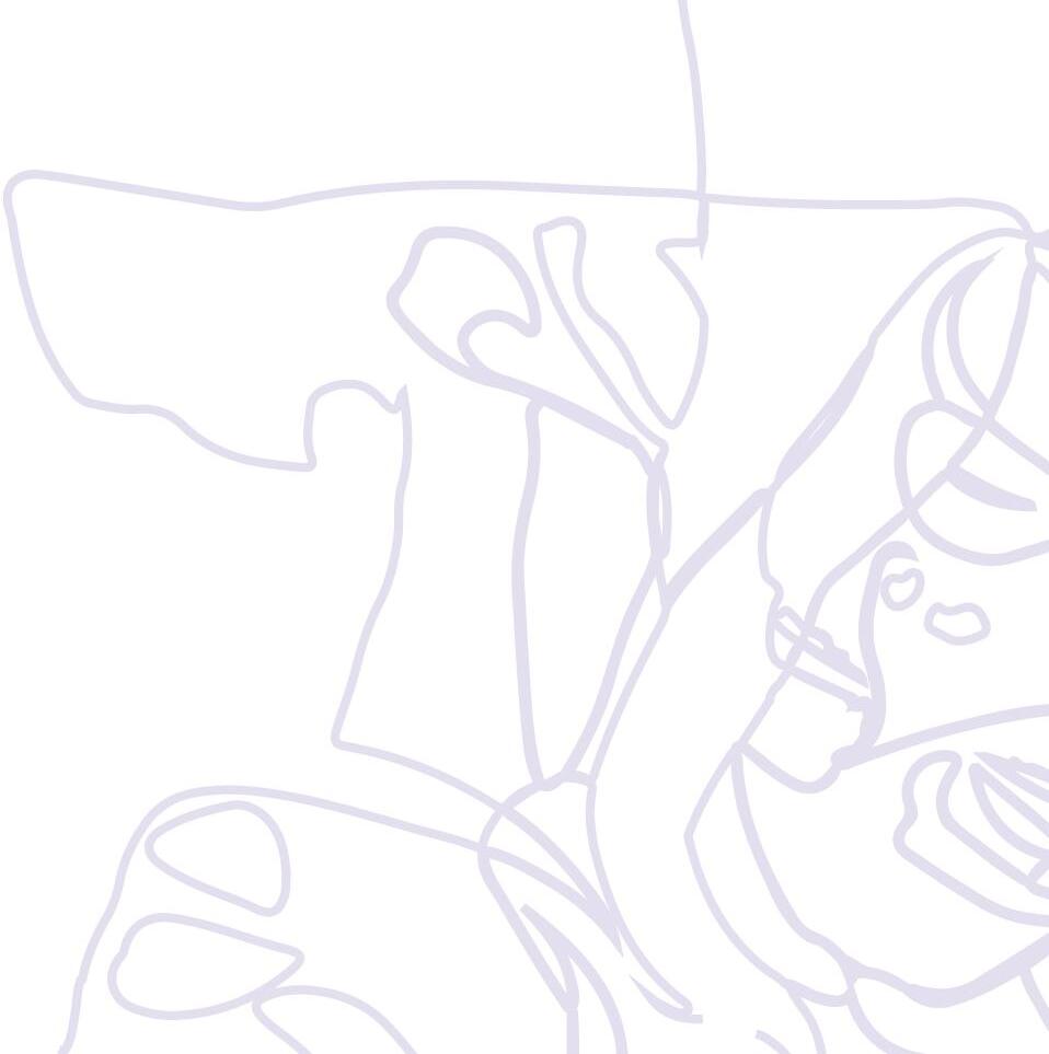 Silent worms live quick, toothless days in circular jelly earths and sugar rivers surrounding. I do not wish to die! Please don’t terrify me with that smile, the same you gave me under the black lights of the holographic, shroomsed Japanese noodle shop. I used to fence the swordiest kind (saber), but now I only fence myself into impossibly uncomfortable situations. My worm committed suicide and they laughed. ey always laugh. Dead, my dove? My phosphorescing violet carrier pigeon? Violent, three-legged bird, teetering by the trash can in the park where I spilled iced tea, sweetened, onto his metallic Vertu. Not even a smartphone, but an old trestle conquered by the forest of African clawed frogs. Reporting daytime nightmares, I bare only myself, highly edited, to the reader, like printed static social media. I keep rewinding to the beads: is it dreaded dream or clunky arolling sideways on mountains and oating inches o the bed. Terrible, o , uncertain experience...everyone says so but you don’t truly know until you also. Forced isolation. Tame, tombless past that erases most moments but a few of ants, heat, and sweat. Under my eyelid I speed the rivers of the sky on a pirate ship of timber and ag. e tip of my tongue bleeds ink onto the bookends and writes o ce memos to the negligent coworkers. Last night, the blue glass chandelier that hung on my bedroom ceiling made a noise and when I checked on it, it crashed like that plane. So I wanted inventor for my job and stuck my broken earphones into the wall socket to x them instead. I just needed more time to pick the beads up, neon plastic barbie brain for breakfast.