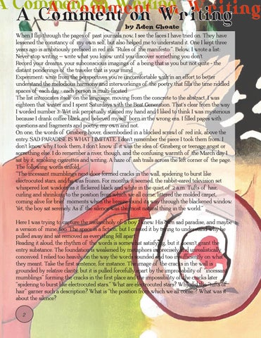 Silent worms live quick, toothless days in circular jelly earths and sugar rivers surrounding. I do not wish to die! Please don’t terrify me with that smile, the same you gave me under the black lights of the holographic, shroomsed Japanese noodle shop. I used to fence the swordiest kind (saber), but now I only fence myself into impossibly uncomfortable situations. My worm committed suicide and they laughed. ey always laugh. Dead, my dove? My phosphorescing violet carrier pigeon? Violent, three-legged bird, teetering by the trash can in the park where I spilled iced tea, sweetened, onto his metallic Vertu. Not even a smartphone, but an old trestle conquered by the forest of African clawed frogs. Reporting daytime nightmares, I bare only myself, highly edited, to the reader, like printed static social media. I keep rewinding to the beads: is it dreaded dream or clunky arolling sideways on mountains and oating inches o the bed. Terrible, o , uncertain experience...everyone says so but you don’t truly know until you also. Forced isolation. Tame, tombless past that erases most moments but a few of ants, heat, and sweat. Under my eyelid I speed the rivers of the sky on a pirate ship of timber and ag. e tip of my tongue bleeds ink onto the bookends and writes o ce memos to the negligent coworkers. Last night, the blue glass chandelier that hung on my bedroom ceiling made a noise and when I checked on it, it crashed like that plane. So I wanted inventor for my job and stuck my broken earphones into the wall socket to x them instead. I just needed more time to pick the beads up, neon plastic barbie brain for breakfast.