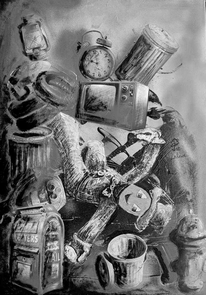 Over the years, Muhachi turned into an avatar for Ledoux to express himself in works like “Junkyard.” Ledoux explores collage and painting together in this piece, which was new territory for him. “In my youth, there was a place down the road called The Sand Pit,” Ledoux shared about the piece. “It was this junkyard full of old cars, objects, tires, etc. I would look at it as a kid in awe. Everything was broken, but kind of took on a new life as I played there; it was like living in a cartoon.”