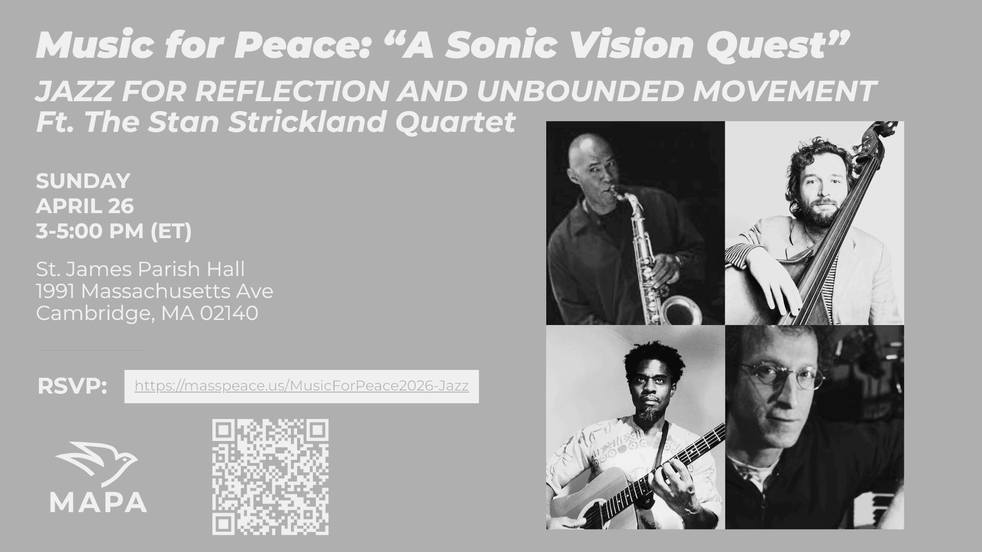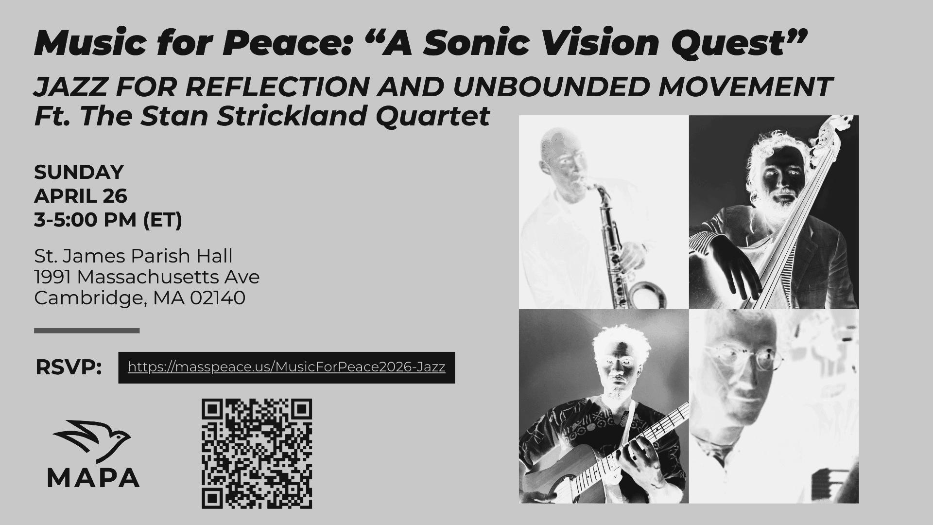 4/26 Music For Peace: A Sonic Vision Quest An evening of jazz for reflection, movement, and community @ St James Parish Hall 3pm-5pm All Ages Donation