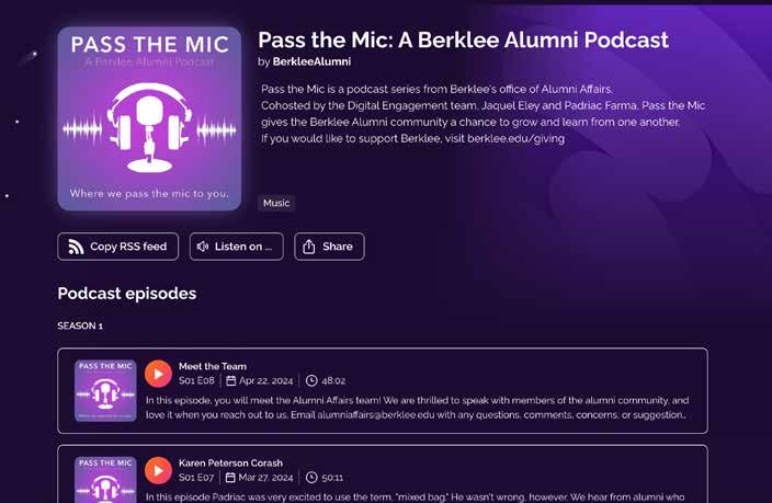 This past year, we leaned into our community for their insight on the future of Berklee. Our community of students, faculty, staff, and alumni were active participants in feedback sessions about our mission and vision, and about the qualities we want our next president to exemplify. You will hear this many times in this report, but we truly cannot do this work without you, our alumni. Your wisdom and experiences help better inform Berklee’s present. This report reviews some of the ways you engaged with Berklee and with each other from June 2023 to May 2024. We reached more of you than ever this year through events across the globe and on media. You shared your time, talent, and treasure with each other and our students. You lent your voices to our new podcast, Pass the Mic, and your movement to the Dance on Film Festival. We thank you!