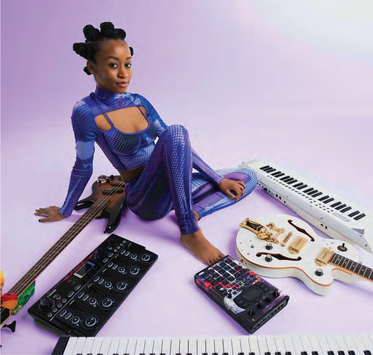 JANAI NEROES B.M. ’23, a multitalented multi-instrumentalist from Dallas, Texas, practices music-making on every level. Known professionally as DAMOYEE, she scored the Cartoon Network’s new show Jessica’s Big Little World, and her TikTok channel, where she posts videos of her building songs live, recently eclipsed 3 million likes.