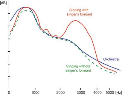 As the demands of opera stars increased, vocal teachers discovered that by manipulating the empty space within the vocal tract, they could emphasize higher frequencies within the overtone series—frequencies above 2500hz. This technique allowed singers to perform without hurting their vocal cords, as they are not actually singing at a higher fundamental decibel level than the orchestra. Swedish voice scientist Johan Sundberg observed this phenomenon when he recorded the world-famous tenor Jussi Bjoerling in 1970. His research showed multiple peaks in decibel level, with the strongest frequency (overtone) falling between 2500 and 3000 hertz. This frequency, known as the singer’s formant , is the “sweet spot” for singers so that we hear their voices soaring over the orchestra into the opera house night after night.