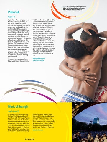 Pillow talk August 4–6 If you haven’t done it yet, make this the summer you head to Becket, in the Berkshires in Western Massachusetts. The lush grounds of Jacobs’s Pillow, the acclaimed and historic dance mecca, is a trip you won’t forget. Celebrating its 85th anniversary season with more than 200 free events, ticketed performances, exhibits and talks, the Pillow again offers its annual Weekend Out (Aug. 4–6) specifically for LGBTQ patrons. The weekend includes a special tour honoring Pillow founder Ted Shawn and his Men Dancers, and a Saturday night dance party with DJ BFG hosted by Tyler Ashley, The Dauphine of Bushwick, after the evening performances. Those performances are from Doug Varone and Dancers in the