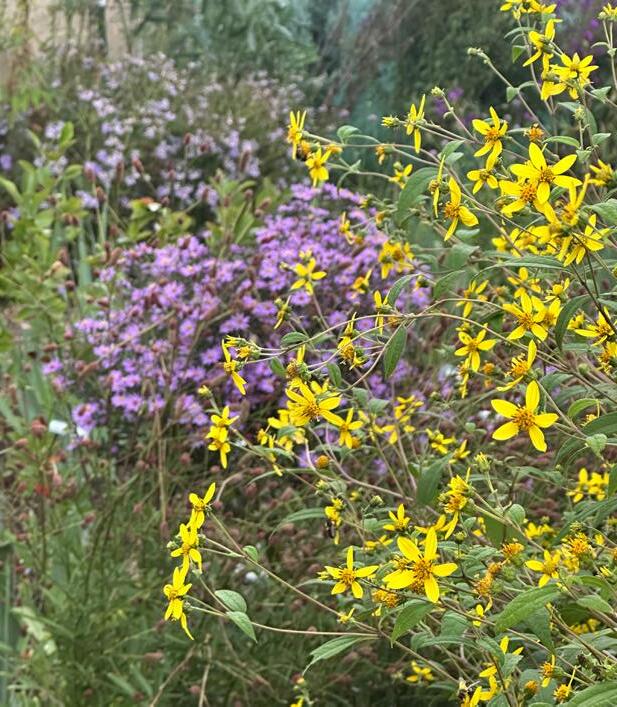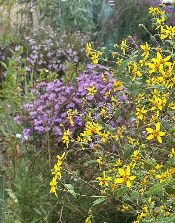 Flowering in September-October, slender, long stems (4-5’ tall in some years) bear abundant clusters of azureblue flowers, loved by pollinators searching for lateseason sustenance.
