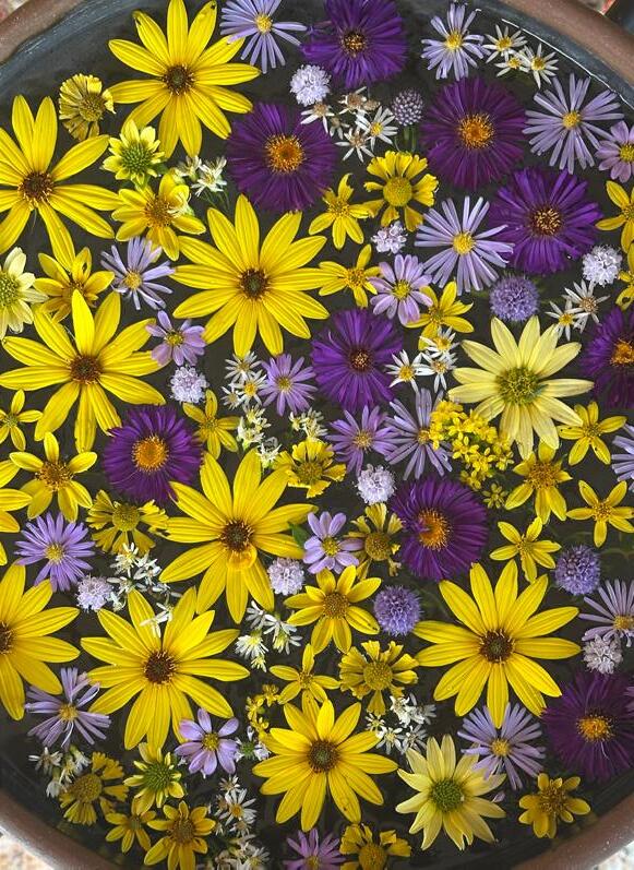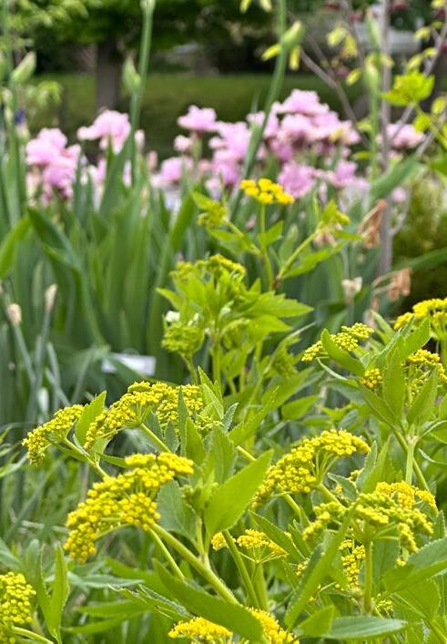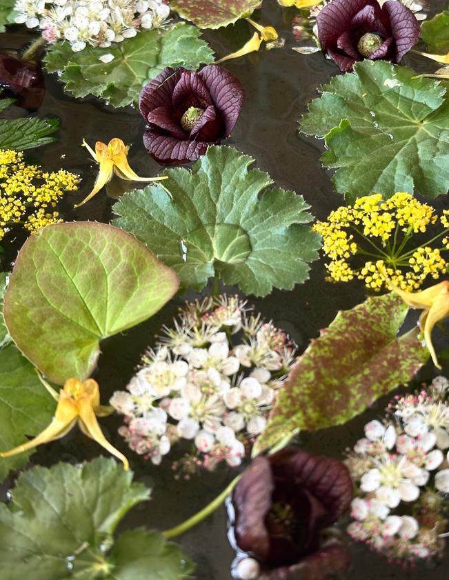 Cover: May 6, 2025 | A mid-spring assemblage of flowers and foliage, a mixture of native and climateappropriate plants, perennials, trees, and shrubs. Ingredients include; flowers of Asimina triloba, Paw Paw; flowers of Aronia melanocarpa, Black Chokeberry; Epimedium leaves and flowers; the golden umbels of Zizia aurea, Golden Alexanders; Heuchera richardosnii, with Prairie Alum Root, clamshell-like leaves.