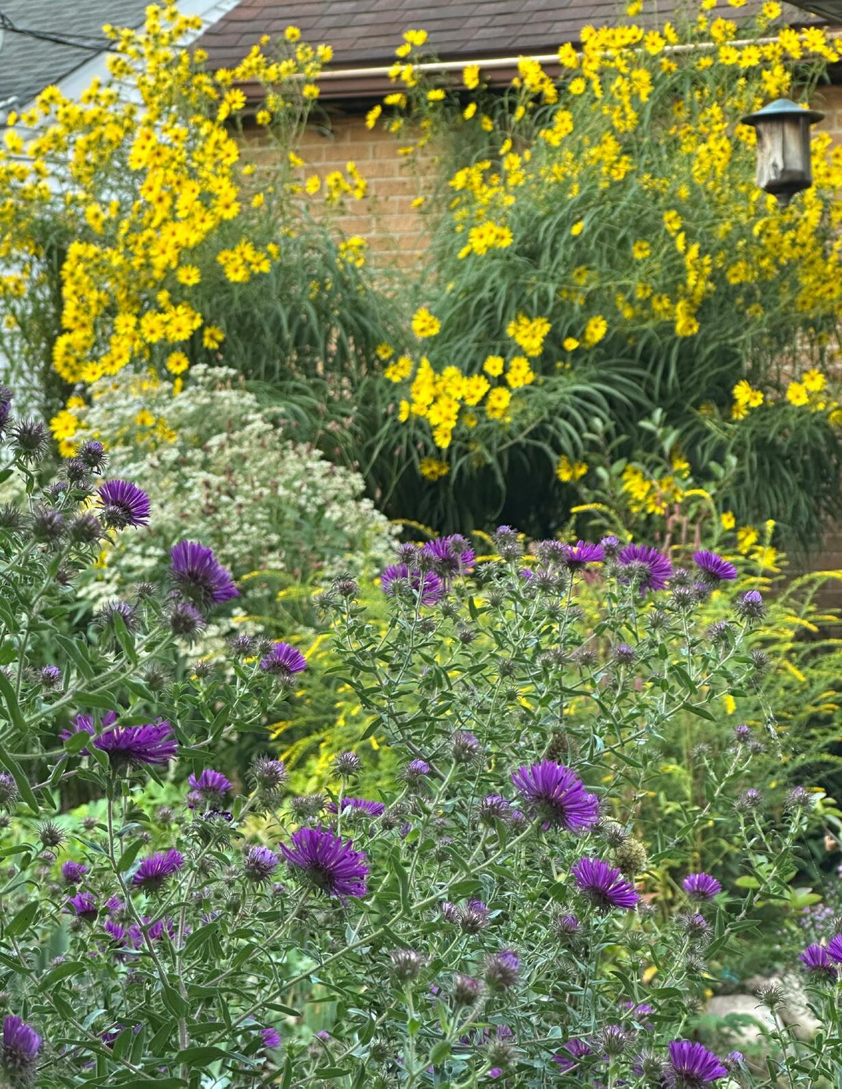 Some have grown as tall as the roof line of our house, at least 12’. Others are a more demure 4-5’ tall. They bloom at the same time as many fall asters and some of the Sanguisorba, too.