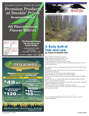 Visit mmjamerica.com to check out our Daily Deals and pricing! BOULDER REC & MED • 1909 Broadway #LL • 303-862-4064 Sun-Wed 10am-7:45pm Thur-Sat 10am-9:45pm 40 September 13, 2018