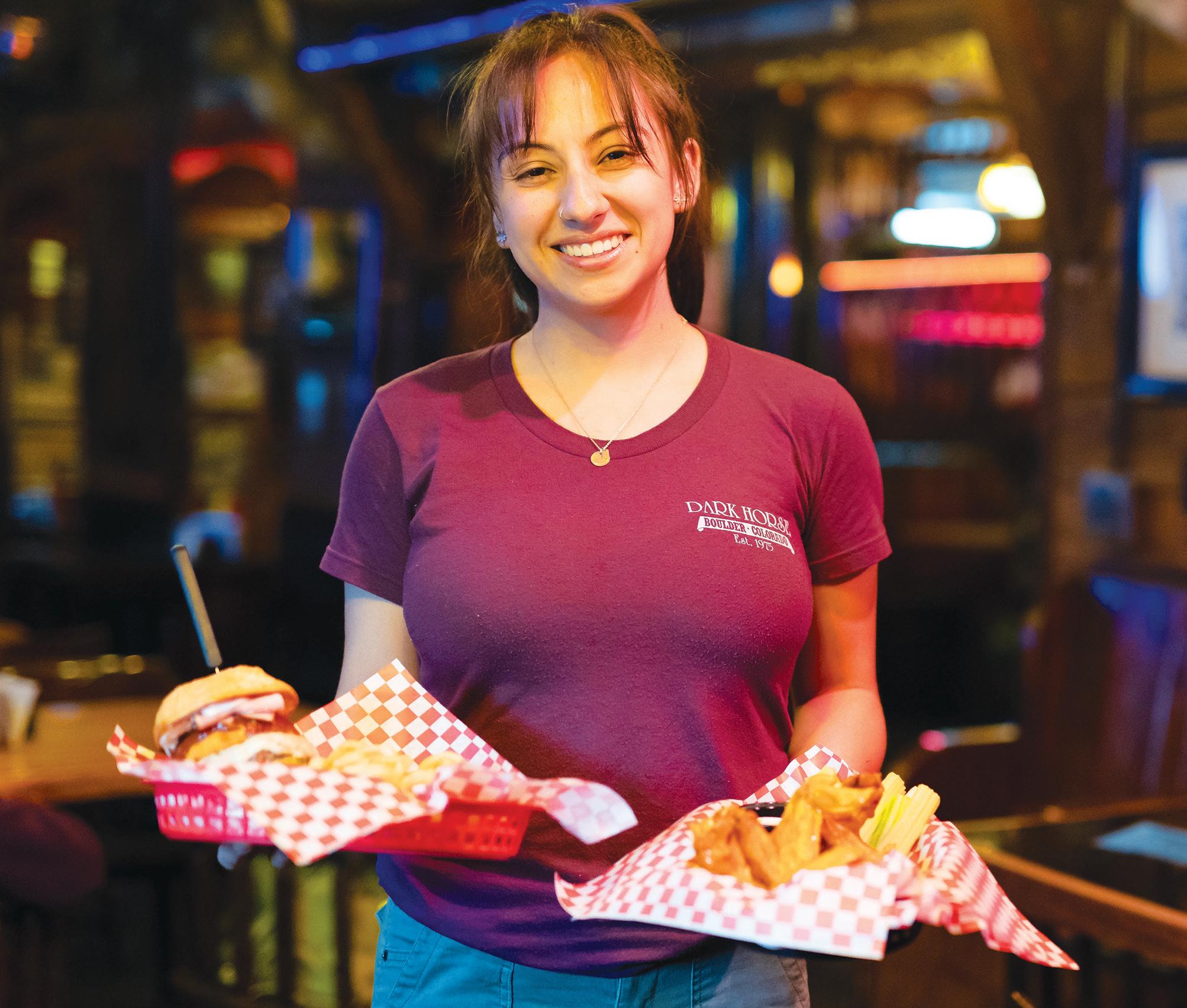 Nobody knows exactly when the World Famous Dark Horse Bar & Grill started frying up Buffalostyle chicken wings to pair with draft beers, but there is no mystery why the 48-year-old institution always beat the competition in this category. The kitchen starts with great local chicken from Red Bird Farms. They crisp-up big, three-joint wings and serve them properly with blue cheese dressing and fresh celery sticks. After that its personal taste with a menu of sauces and preparations including extra hot, barbecue, teriyaki, spicy dry rub and Carolinastyle barbecue or better yet, a combination. No wonder generations of students and locals have made these wings famous.