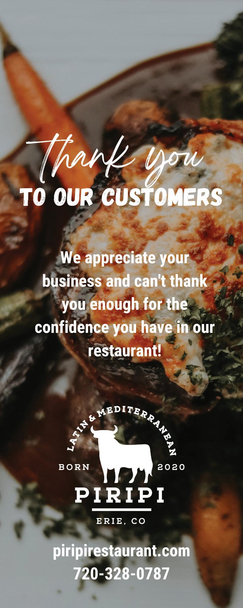 BOULDER COUNTY’S INDEPENDENT VOICE l OCTOBER 27, 2022 l 27 GROW YOUR FUTURE WITH ESCOFFIER www.escoffier.edu SIMPLE | LOCAL | FARM TO TABLE 578 Briggs Street Erie, CO 80516 303.828.1392 www.24carrotbistro.com DINNER TUE THUR 4:30PM 9PM BRUNCH SAT & SUN 9 AM - 2 PM LUNCH TUE FRI 11AM 2PM VOTED BEST AMERICAN RESTAURANT RESERVATIONS AVAILABLE ONLINE 303.604.6351 | 1377 FOREST PARK CIRCLE, LAFAYETTE New Hours: Open 7 days a week: 7:30am - 3:00pm daily Voted East County’s BEST Gluten Free Menu Order Online at morningglorylafayette.com