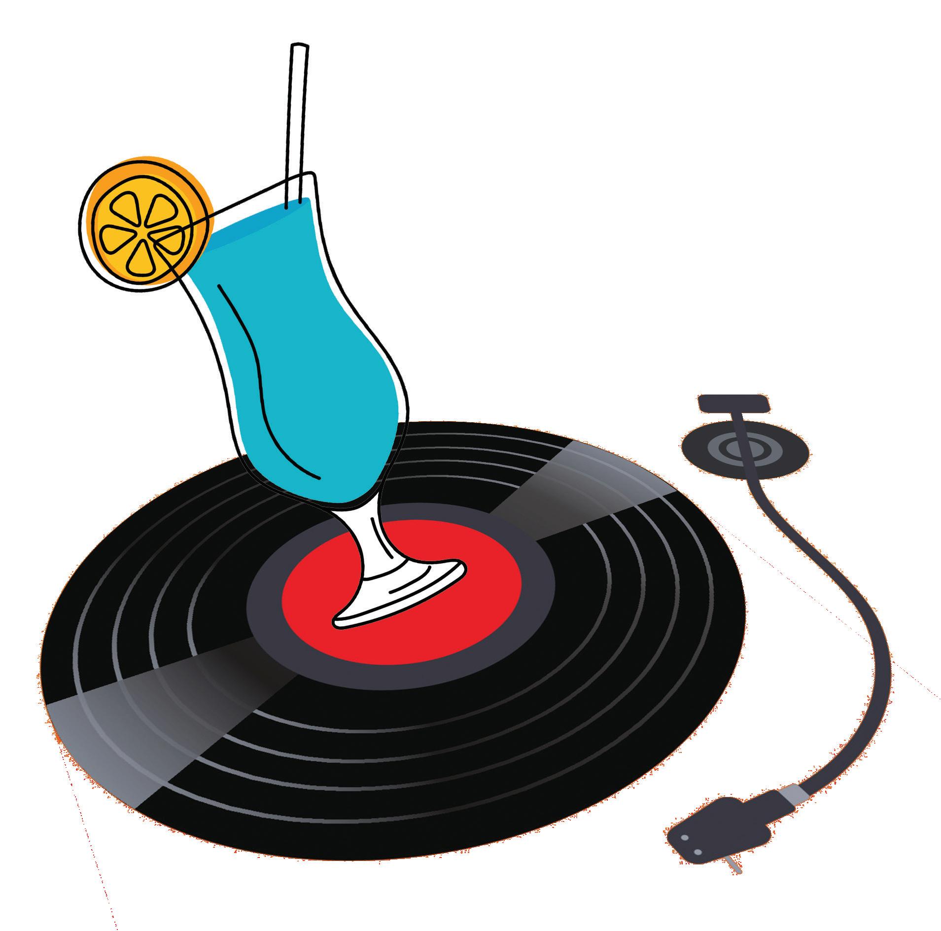 The book Booze and Vinyl by brother-and-sister writing team André and Tenaya Dar lington, features a buzz-evok ing and artistically inviting layout of cocktail-, rock- and pop-related photos, along with some excellent ideas for what to pour in your glass. The book rec ommends Planter’s Punch (and sitting in lawn chairs) while enjoying Bob Marley & The Wailers; a tequila sunrise to accompany the Rolling Stones; a dirty martini for anything by Iggy Pop; a gin and tonic for the sounds of The Clash; a fshbowl (which blends rum, vodka and blue curaçao, among other things) for Wilco; a piña colada for the Beach Boys; Yorsh (a Russian-inspired blend of Vodka and beer) for Nirvana; a little absinthe for Amy Winehouse; a Manhattan for Sinatra; a Velvet Hamer (cognac, cream and liqueur) for Marvin Gaye; a shot of Jameson and a Harp (beer) for The Pogues; and lots of other intriguing combinations for when unwinding with a cup in hand.
