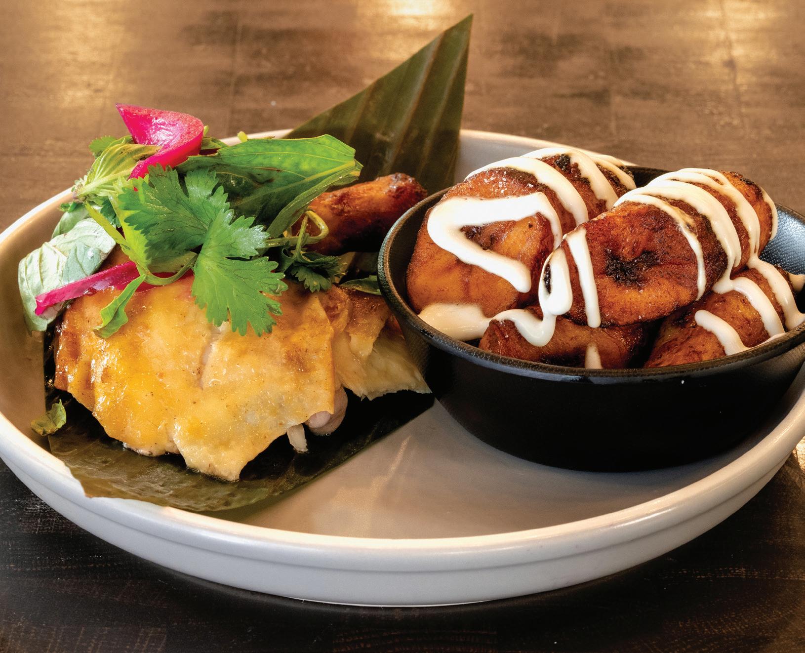 It’s safe to say that the food at Pollo Tico is person al. The menu centers around half or quarter rotisserie chicken served with homemade sauces and sides. “We do have the Michelin-style standards in the kitchen,” says Gomez, noting that though the menu may appear simple, this is still the kind of cuisine beftting the celeb rity chef’s pedigree. There’s the chicken patacon, which lays shredded chicken, sofrito, red cabbage, escabeche vegetables and salsa de chile amarillo atop twice-fried green plantains for a kind of open-faced sandwich. The house-made sauces are foundational and fundamental, with the creamy salsa verde, a tamarindo sauce, the sofrito de tomate, the habanero chicha de pina hot sauce and the chimichurri all being sold in bottles. These are the kind of sauces no home kitchen is complete without.