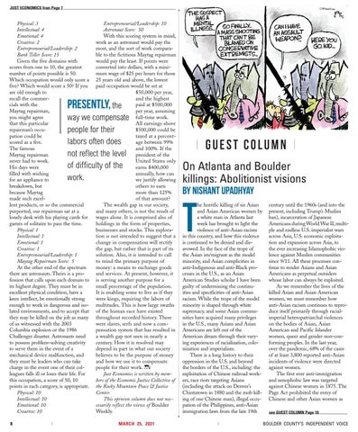 century until the 1960s (and into the present, including Trump’s Muslim ban), incarceration of Japanese Americans during World War II, multiple and endless U.S. imperialist wars across Asia, U.S. economic exploitation and expansion across Asia, to the ever increasing Islamophobic violence against Muslim communities since 9/11. All these processes continue to render Asians and Asian Americans as perpetual outsiders whose labor can always be exploited. As we remember the lives of the killed Asian and Asian American women, we must remember how anti-Asian racism continues to reproduce itself primarily through racialimperial heteropatriarchal violences on the bodies of Asian, Asian American and Pacific Islander women, queer and gender non-conforming peoples. In the last year, over the pandemic, 68% of the cases of at least 3,800 reported anti-Asian incidents of violence were directed against women. The first ever anti-immigration and xenophobic law was targeted against Chinese women in 1875. The Page Act prohibited the entry of Chinese and other Asian women as see GUEST COLUMN Page 10