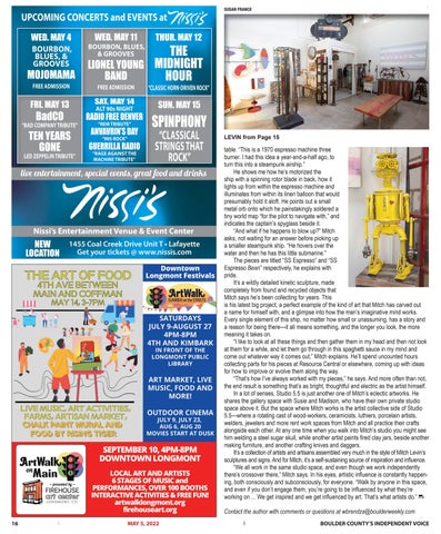 table. “This is a 1970 espresso machine three burner. I had this idea a year-and-a-half ago, to turn this into a steampunk airship.” He shows me how he’s motorized the ship with a spinning rotor blade in back, how it lights up from within the espresso machine and illuminates from within its linen balloon that would presumably hold it aloft. He points out a small metal orb onto which he painstakingly soldered a tiny world map “for the pilot to navigate with,” and indicates the captain’s spyglass beside it. “And what if he happens to blow up?” Mitch asks, not waiting for an answer before picking up a smaller steampunk ship. “He hovers over the water and then he has this little submarine.” The pieces are titled “SS Espresso” and “SS Espresso Bean” respectively, he explains with pride. It’s a wildly detailed kinetic sculpture, made completely from found and recycled objects that Mitch says he’s been collecting for years. This is his latest big project, a perfect example of the kind of art that Mitch has carved out a name for himself with, and a glimpse into how the man’s imaginative mind works. Every single element of this ship, no matter how small or unassuming, has a story and a reason for being there—it all means something, and the longer you look, the more meaning it takes on. “I like to look at all these things and then gather them in my head and then not look at them for a while, and let them go through in this spaghetti sauce in my mind and come out whatever way it comes out,” Mitch explains. He’ll spend uncounted hours collecting parts for his pieces at Resource Central or elsewhere, coming up with ideas for how to improve or evolve them along the way. “That’s how I’ve always worked with my pieces,” he says. And more often than not, the end result is something that’s as bright, thoughtful and electric as the artist himself. In a lot of senses, Studio 5.5 is just another one of Mitch’s eclectic artworks. He shares the gallery space with Susie and Madison, who have their own private studio space above it. But the space where Mitch works is the artist collective side of Studio 5.5—where a rotating cast of wood-workers, ceramicists, luthiers, porcelain artists, welders, jewelers and more rent work spaces from Mitch and all practice their crafts alongside each other. At any one time when you walk into Mitch’s studio you might see him welding a steel sugar skull, while another artist paints fired clay jars, beside another making furniture, and another crafting knives and daggers. It’s a collection of artists and artisans assembled very much in the style of Mitch Levin’s sculptures and signs. And for Mitch, it’s a self-sustaining source of inspiration and influence. “We all work in the same studio space, and even though we work independently there’s crossover there,” Mitch says. In his eyes, artistic influence is constantly happening, both consciously and subconsciously, for everyone. “Walk by anyone in this space, and even if you don’t engage them, you’re going to be influenced by what they’re working on ... We get inspired and we get influenced by art. That’s what artists do.” Contact the author with comments or questions at wbrendza@boulderweekly.com