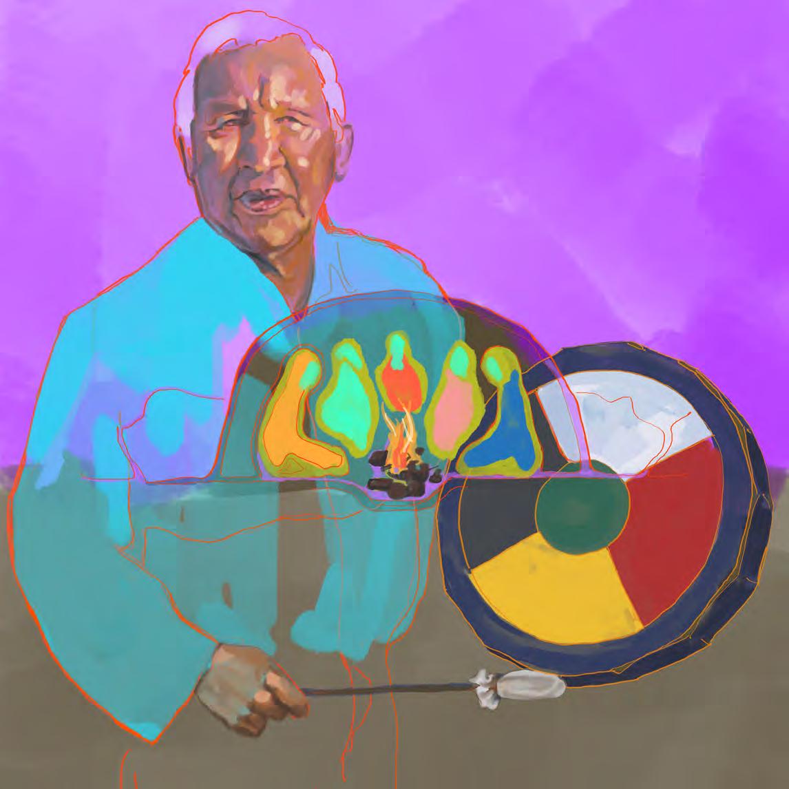 and drugs. He thanked the Creator for releasing him from addiction and prayed the Creator would channel goodness through his heart. Then he spoke in his ancestral tongue and sang in a deep bass tone while beating his drum. Denny’s drum joined in, and the small space echoed with loud thumping.