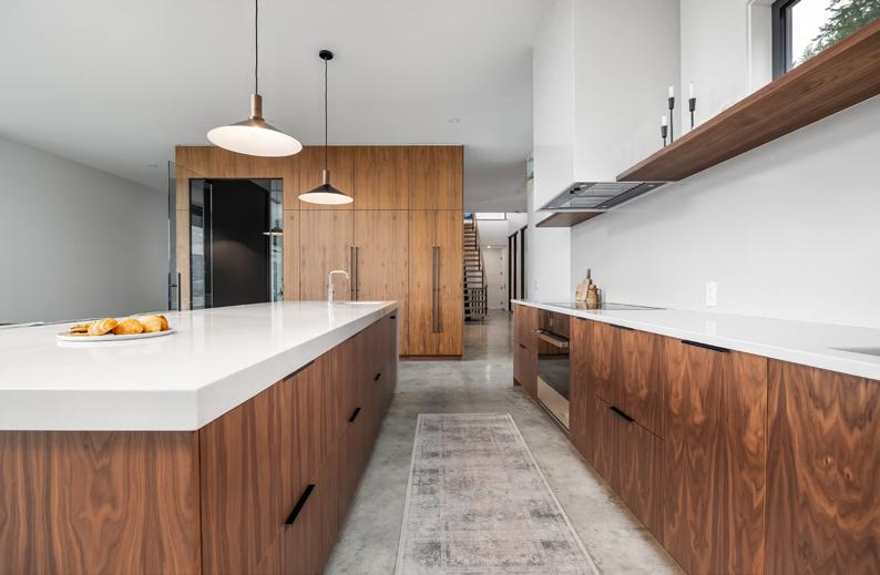Beyond is the heart of the home: a living area anchored by a fireplace with custom micro cement detailing. The kitchen is simple and clean, with walnut cabinetry, a hidden pantry, and a stone countertop that continues up the backsplash. Again, white and walnut are used here for contrast and warmth, while a large island is positioned to capture the lake view.