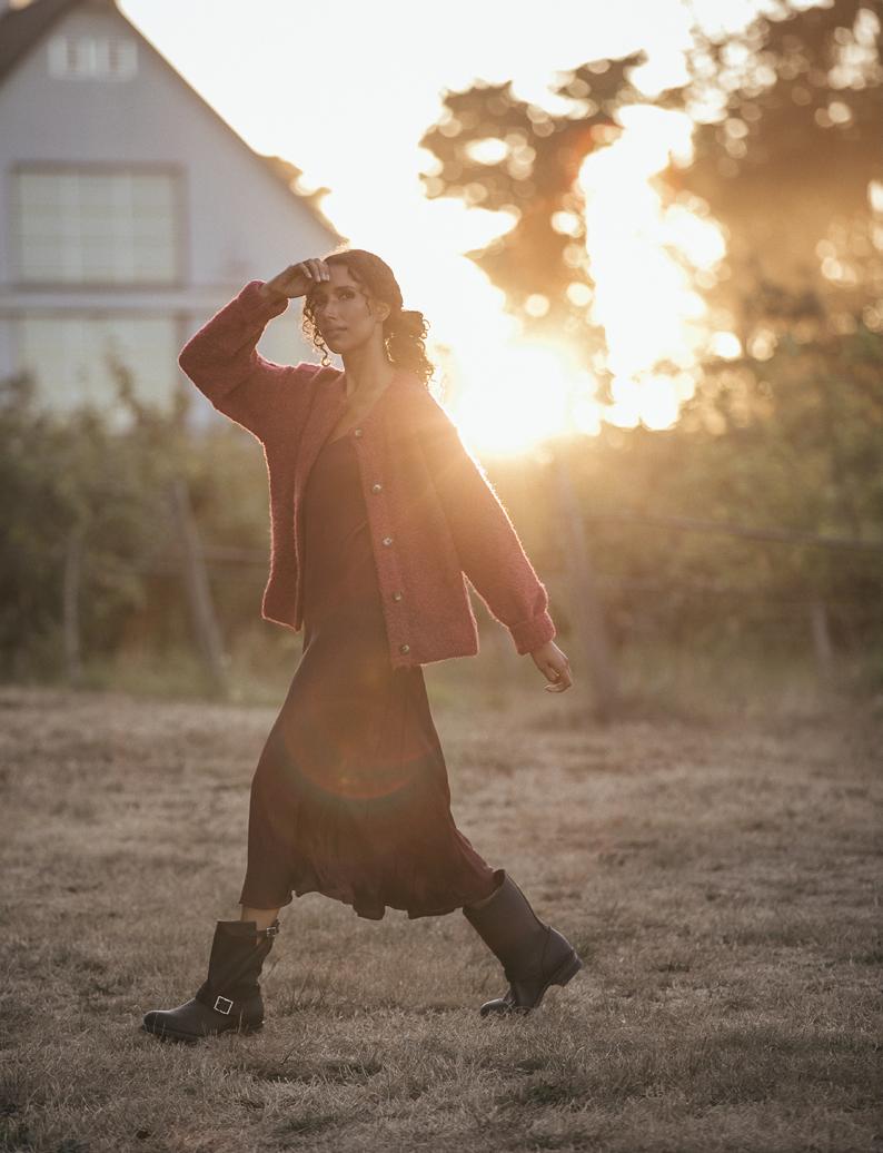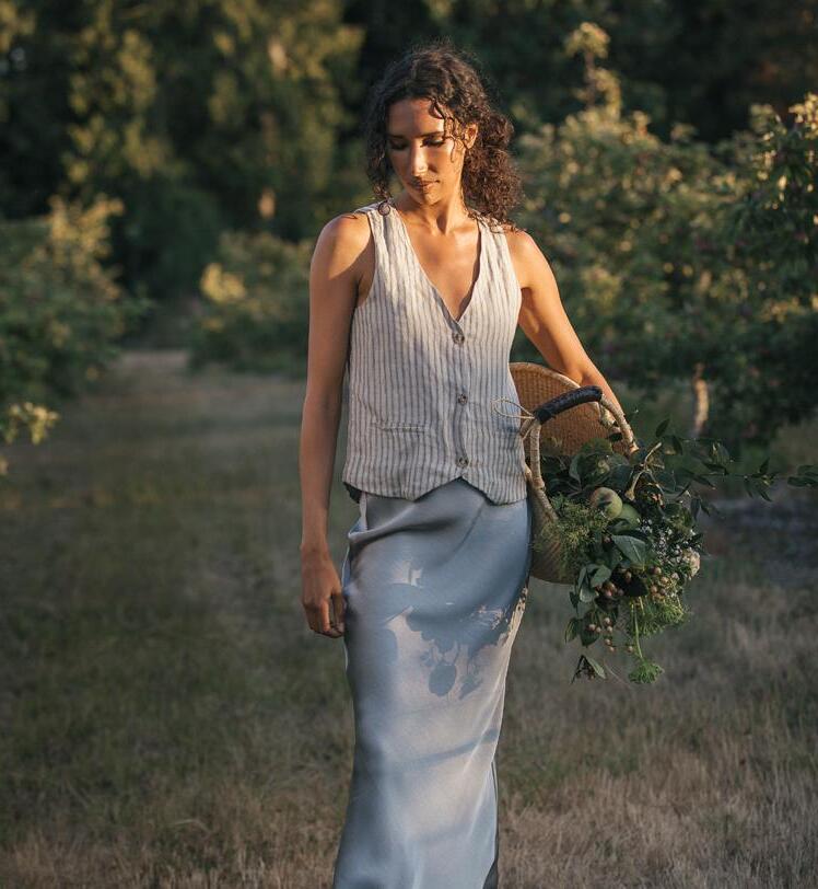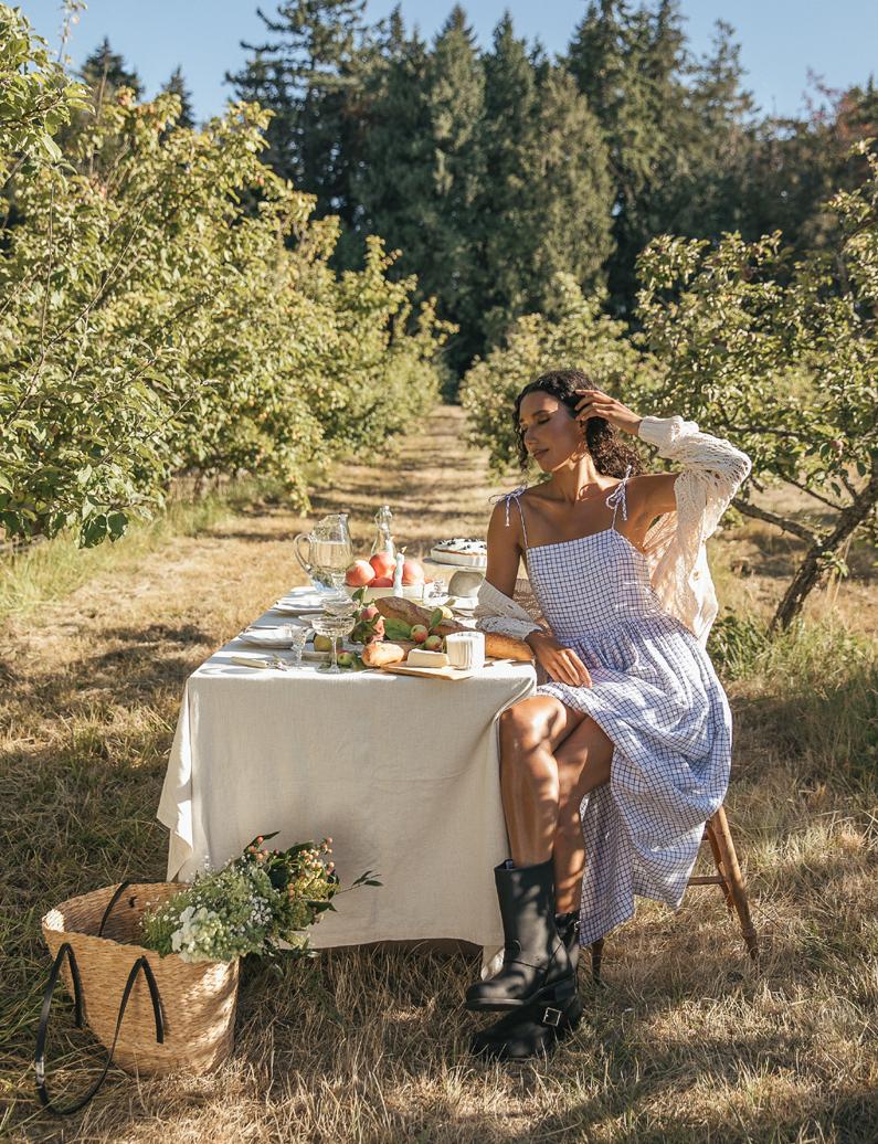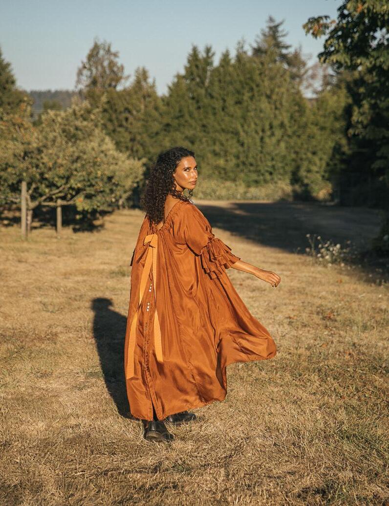 For the “fire and feast” theme of this edition of Boulevard, our fashion team—photographer Michelle Proctor, stylist Jen Evans and makeup artist Jen Clark—chased the golden-hour light through the stunning orchard at Sea Cider Farm & Ciderhouse. Located on Oldfield Road in the Saanich Peninsula, the 10-acre farm, with over 1,300 apple trees and 50 varieties of heirloom apples, offered the perfect backdrop for this ethereal fashion story.