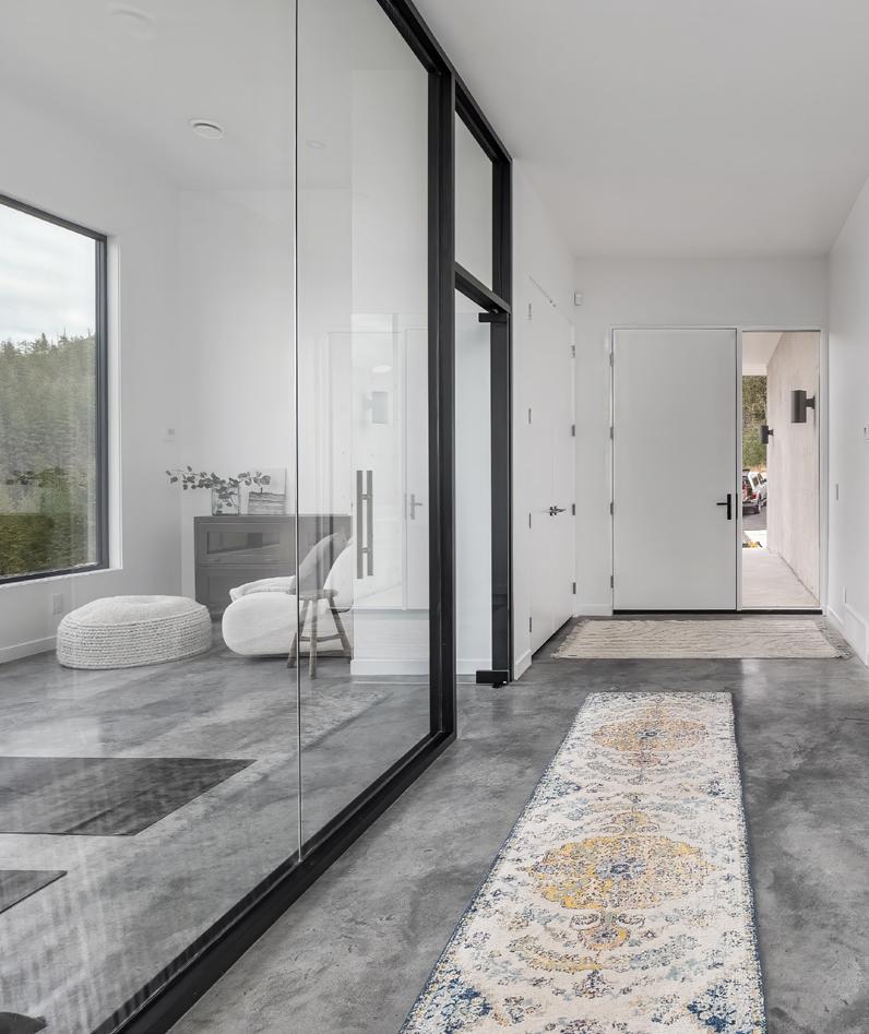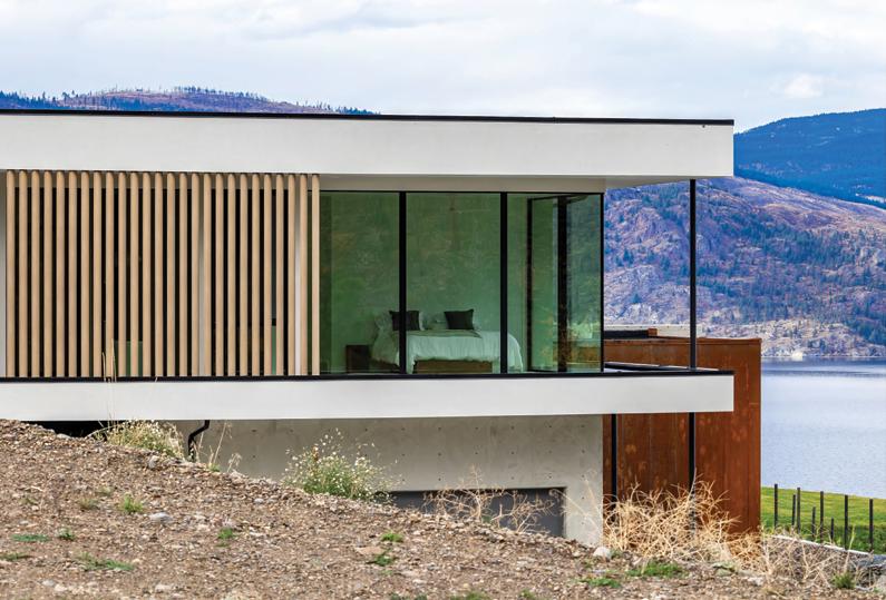 Inside and immediately to the right is a glass-walled office that offers immediate panoramic views of Okanagan Lake. I can imagine inviting clients here or hitting the spin bike before work with this panorama as a backdrop. “The layout is designed deliberately to reveal itself gradually,” Chris explains.