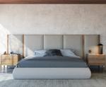 Between the guest rooms lies the master bedroom, a dream space enclosed by floor-to-ceiling glass that once again reveals the magnificent lake views. To the right, the master ensuite features a large soaker tub tucked behind the architectural fins, offering both privacy and openness. Double sinks rest within a custom concrete vanity, while wall-mounted faucets maintain clean, unbroken lines, and a spacious shower remains discreetly hidden from view.