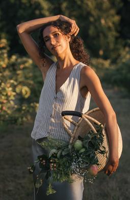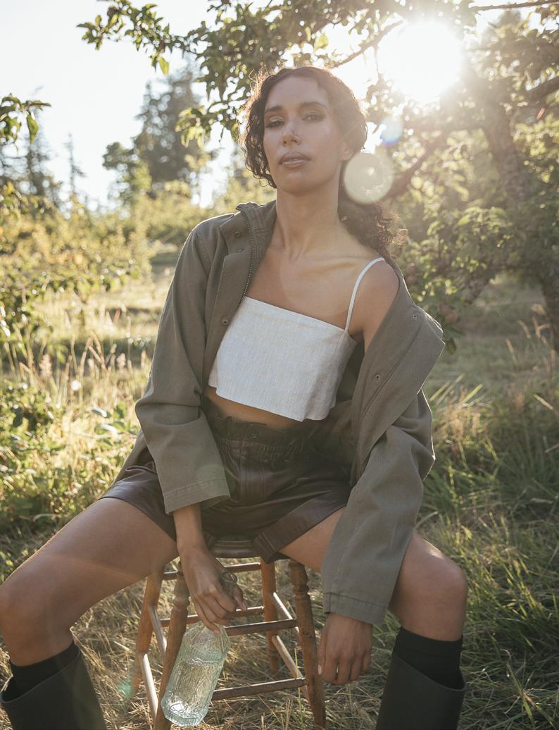 Model Leila Moon, photographed in the orchard at Sea Cider Farm & Ciderhouse.