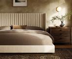 Upstairs on the top level, I turn around and catch another glimpse of the lake, perfectly framed by a landing window, like nature’s own wall art. The hallway leads to three bedrooms, each with its own ensuite. On either side, the guest rooms mirror one another in both form and feeling: simple, considered spaces where higher-set windows hold the lake gently in view. The bathrooms continue the home’s palette of walnut veneer, concrete, and manmade stone, carrying the material story seamlessly from one floor to the next.